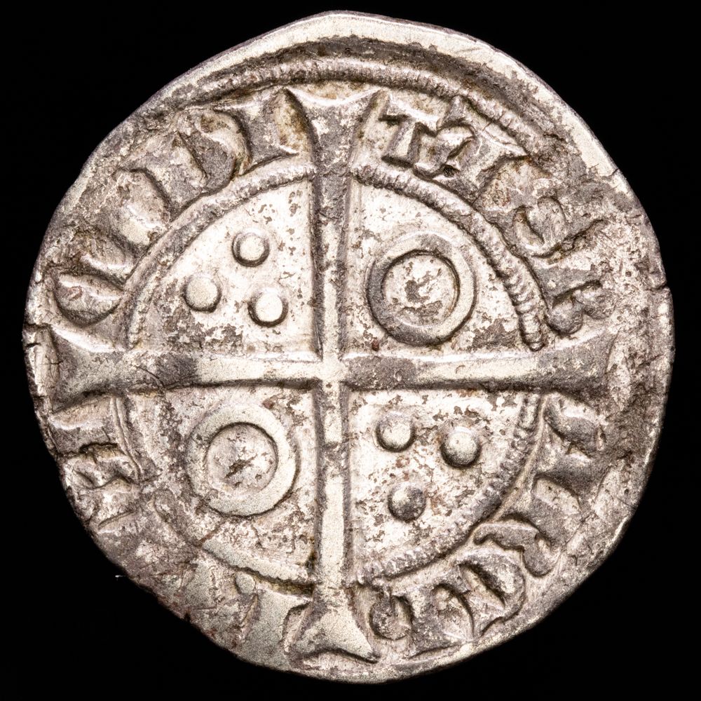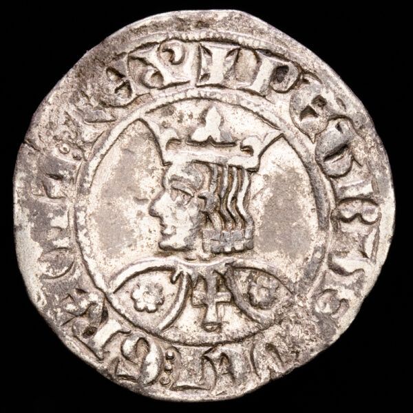 Flores de seis pétalos y cruz en el vestido. Letra T gótica en anverso y latina en reverso.