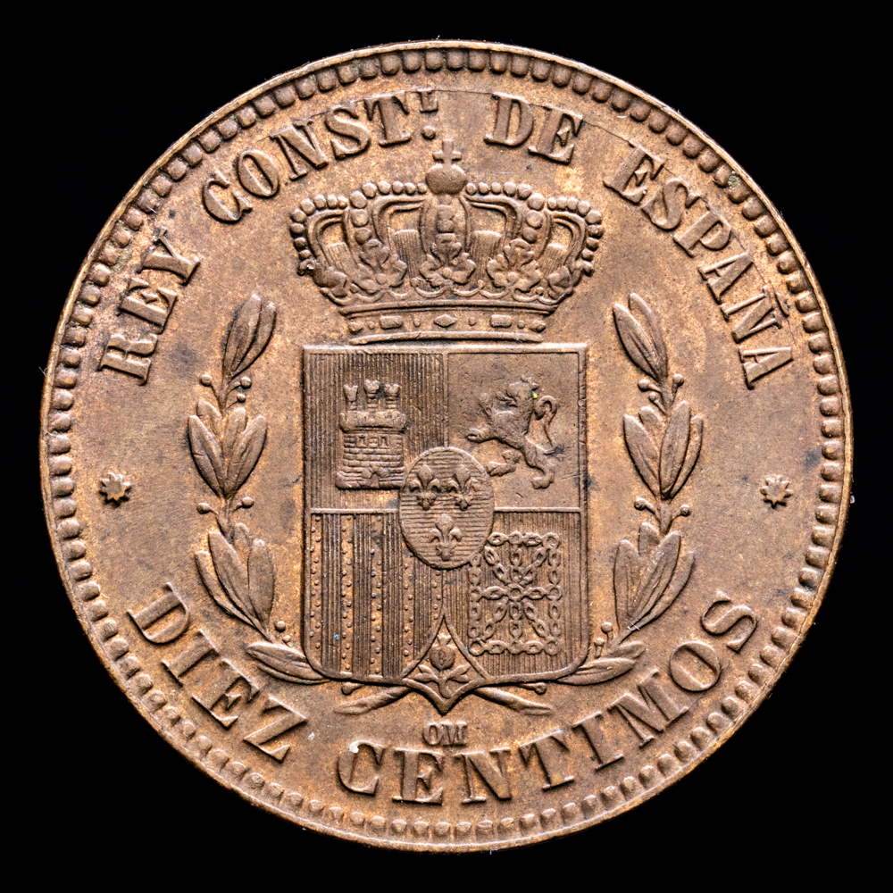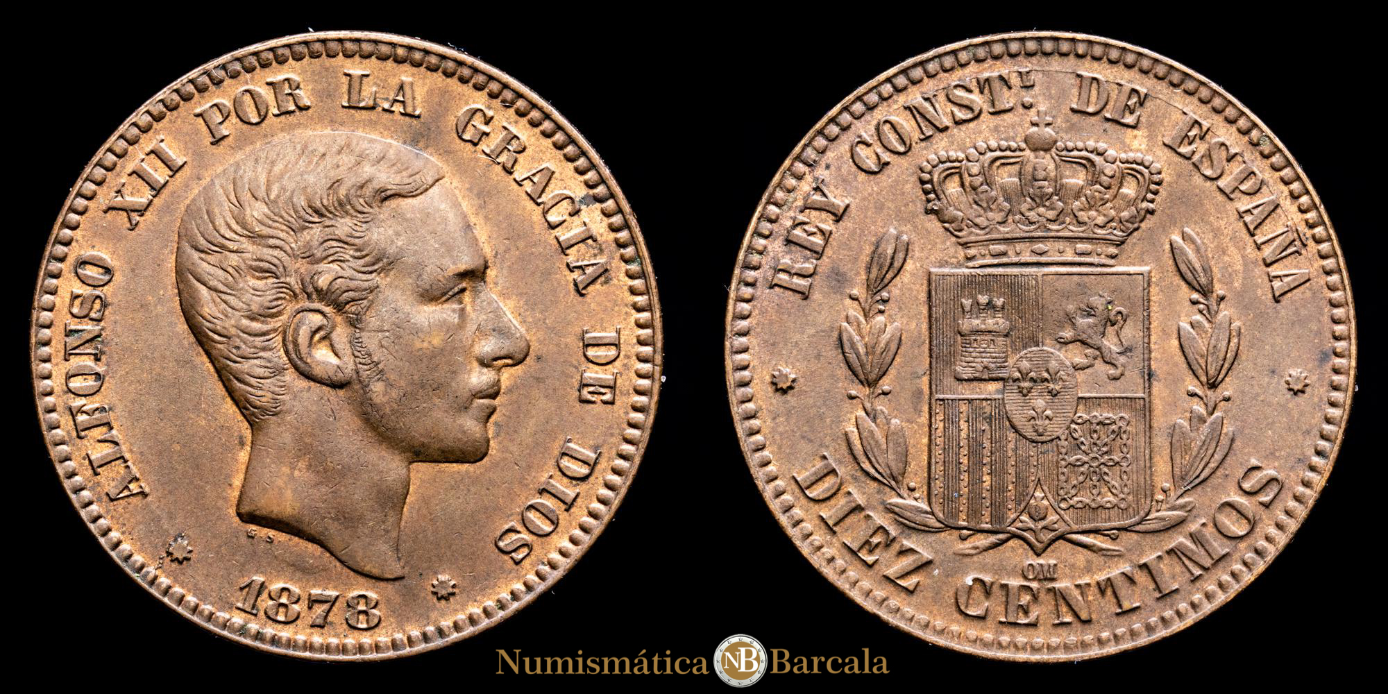 Alfonso XII. 10 Céntimos. (10,16 g.). Barcelona. 1878. Ensayador D·M. Aureo y Calicó – 9. EBC. Restos de brillo original.