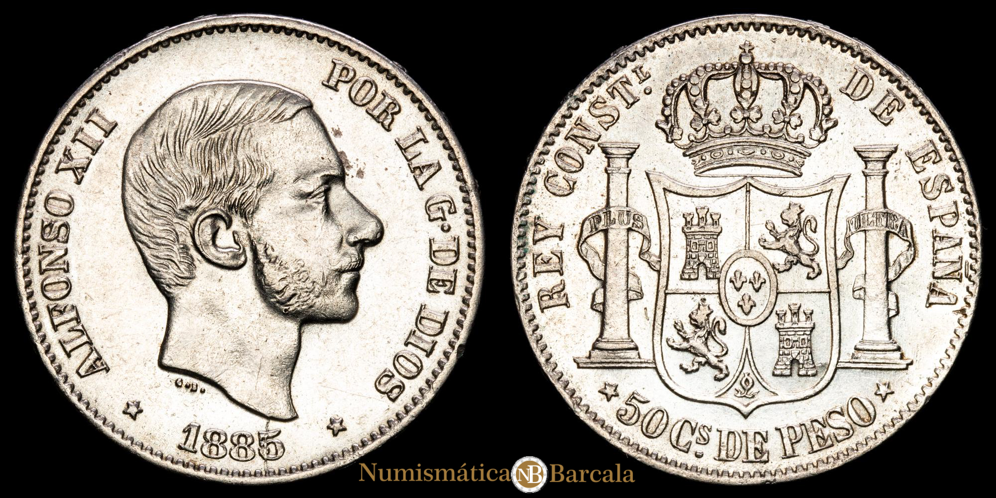 Numismática Barcala > Productos > Monarquia Española > Centenario > 1874-1885 Alfonso XII > Alfonso XII. 50 Céntimos de Peso. (12,99g.). Manila. 1885. Ensayador I. AC-124. XF+.
