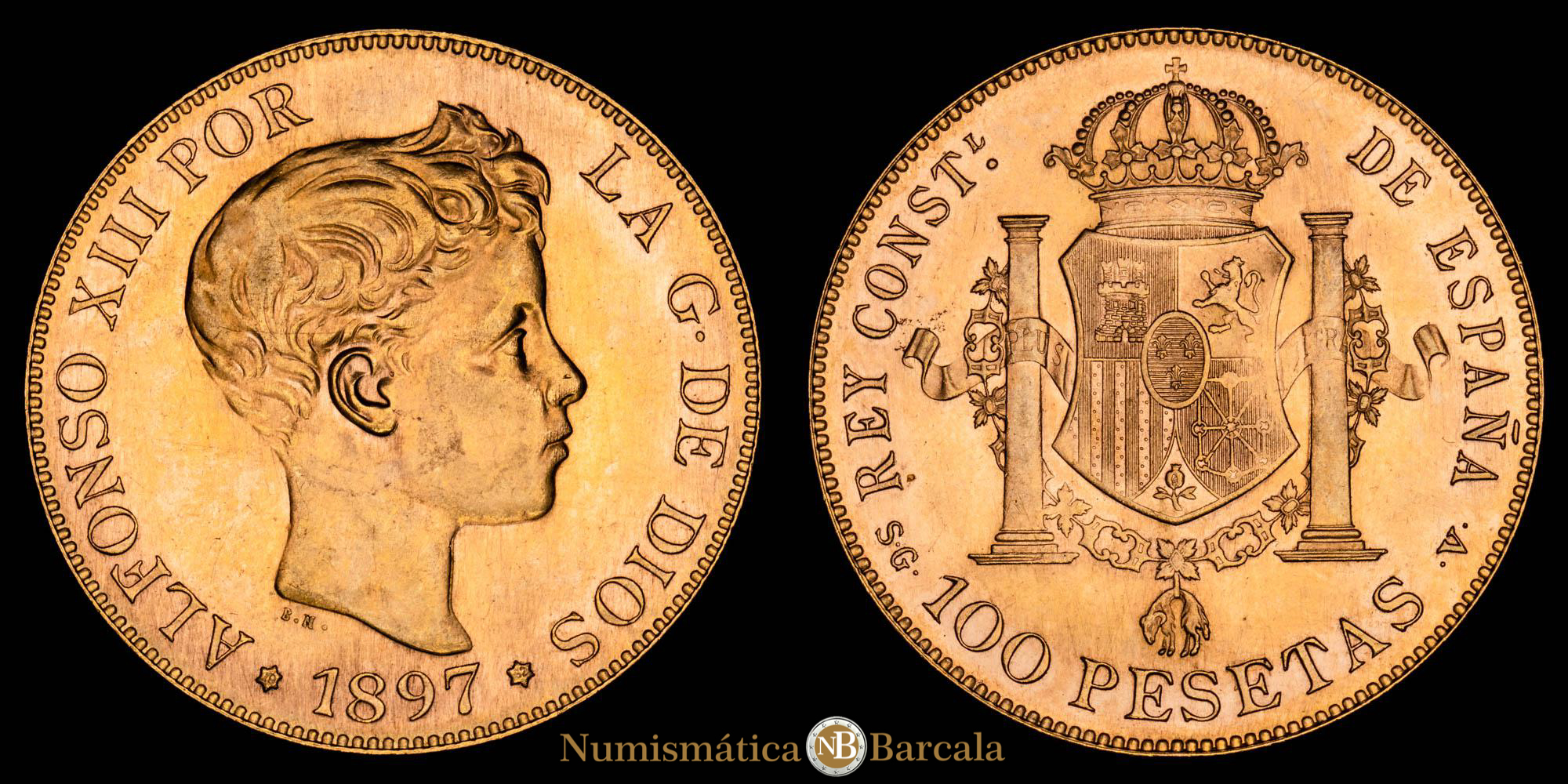Alfonso XIII. 100 Pesetas. (32,33 g.). Madrid. 1897 *19-62*. Ensayador SG·V. Aureo y Calicó – 177. SC. Brillo original. Reacuñación