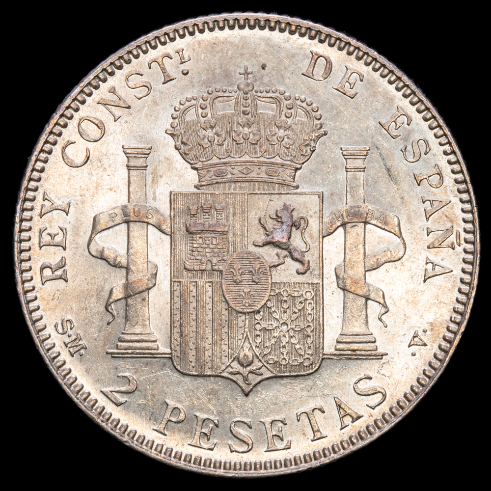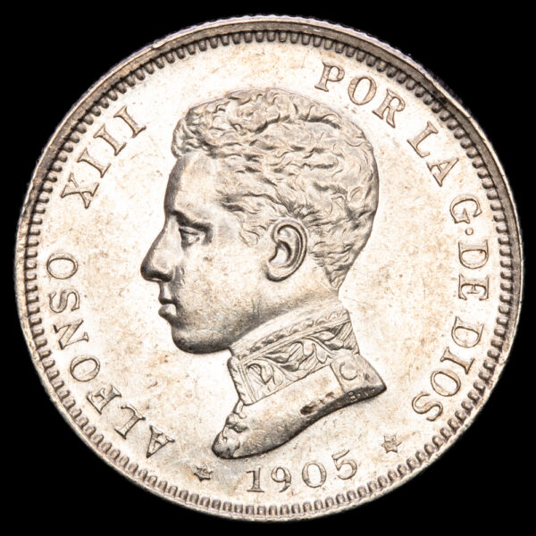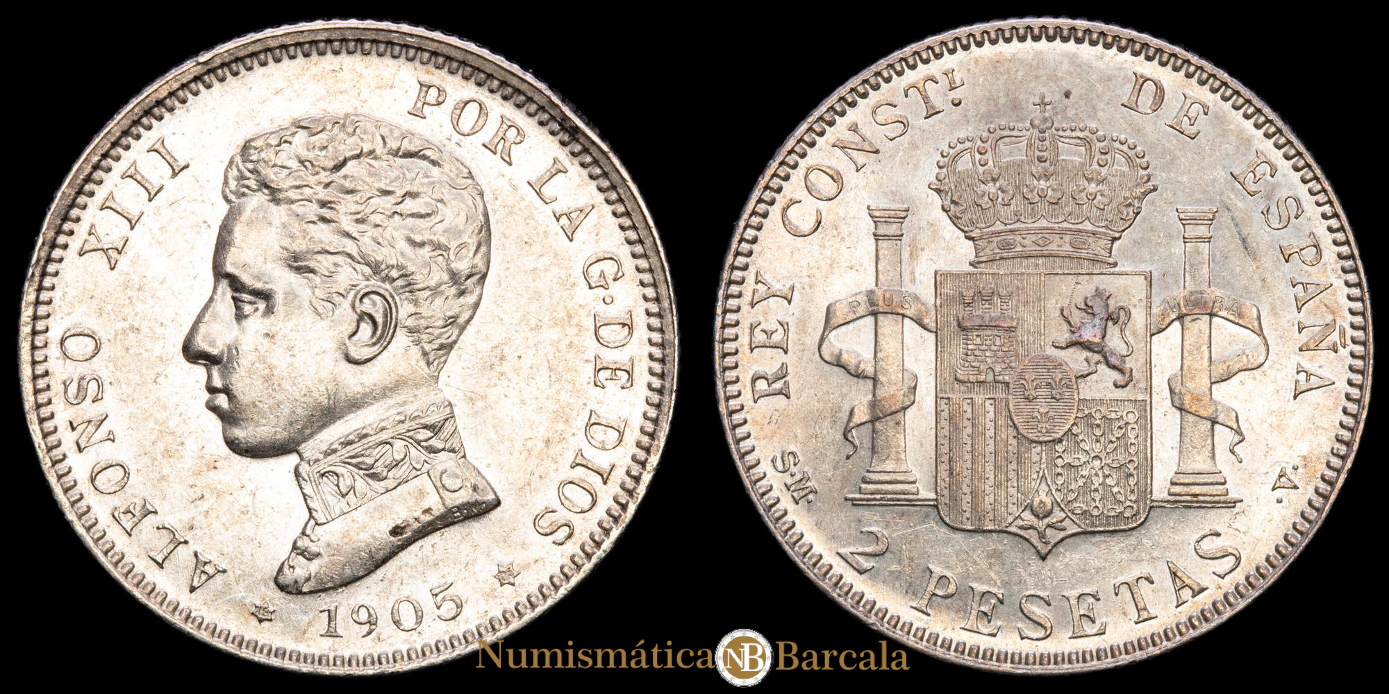 Numismática Barcala > Productos > Monarquia Española > Centenario > 1886-1931 Alfonso XIII > Alfonso XIII. 2 Pesetas (10,07 g.). 1905 – *19-05*. Ensayador SM·V. AC-88. UNC
