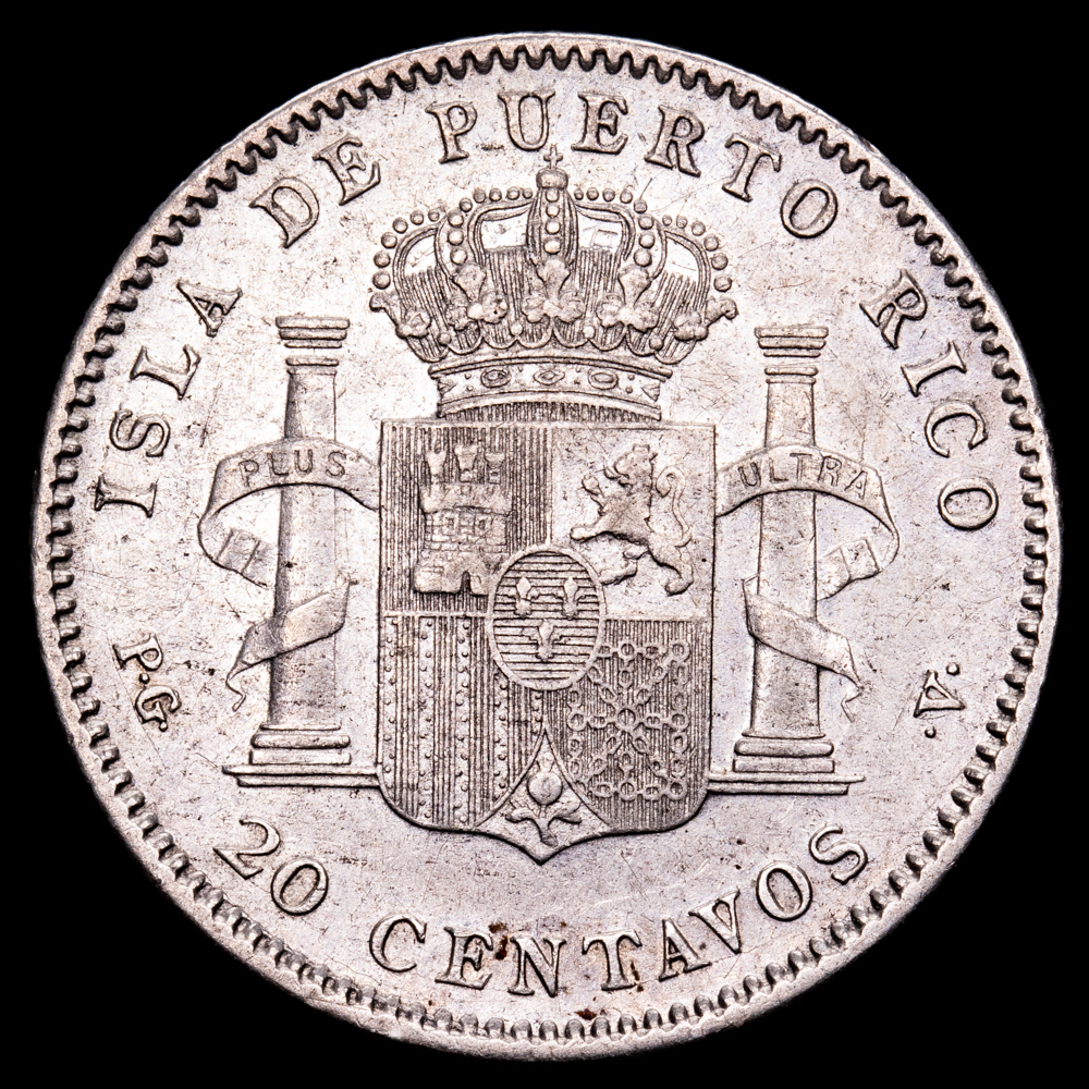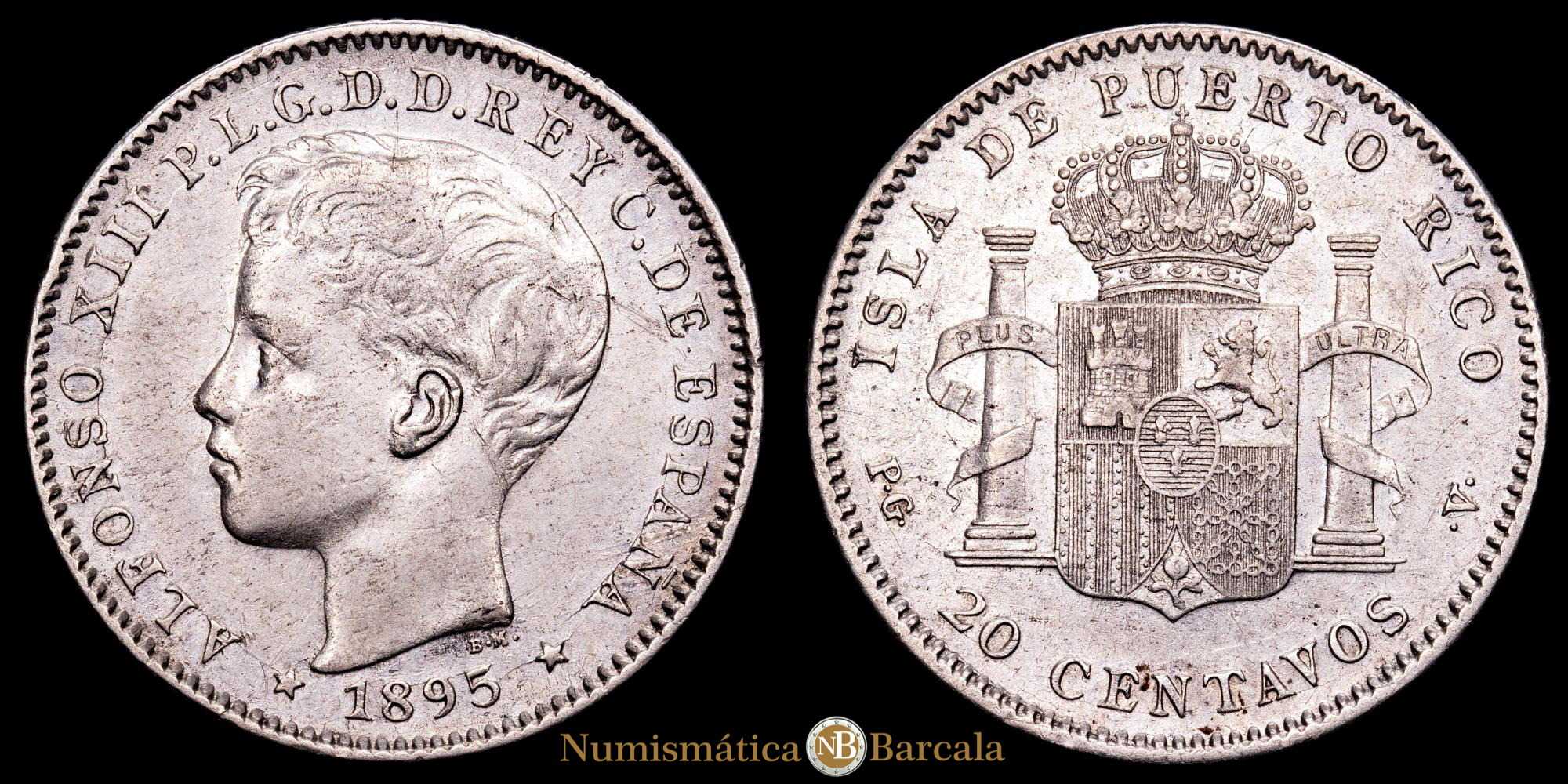 Numismática Barcala > Productos > Monarquia Española > Centenario > 1886-1931 Alfonso XIII > Alfonso XIII. 20 céntimos. (5,02 g.). Puerto Rico. 1895. Ensayador PG·V. AC-126. MBC+. Escasa.