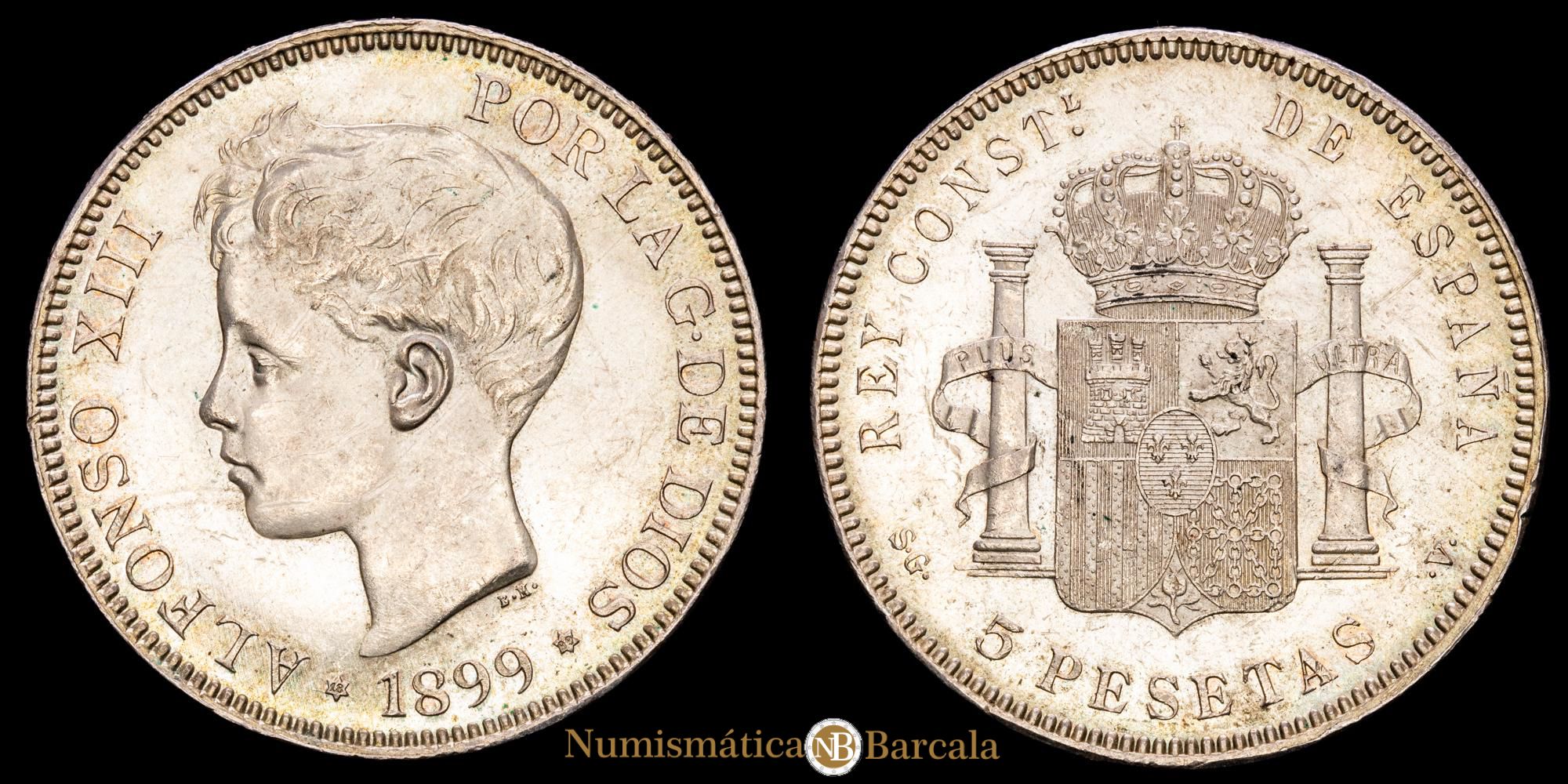 Numismática Barcala > Productos > Monarquia Española > Centenario > 1886-1931 Alfonso XIII > Alfonso XIII. 5 Pesetas (25,15 G.). 1899 *18-99*. Madrid. Ensayador SG·V. AC-110.