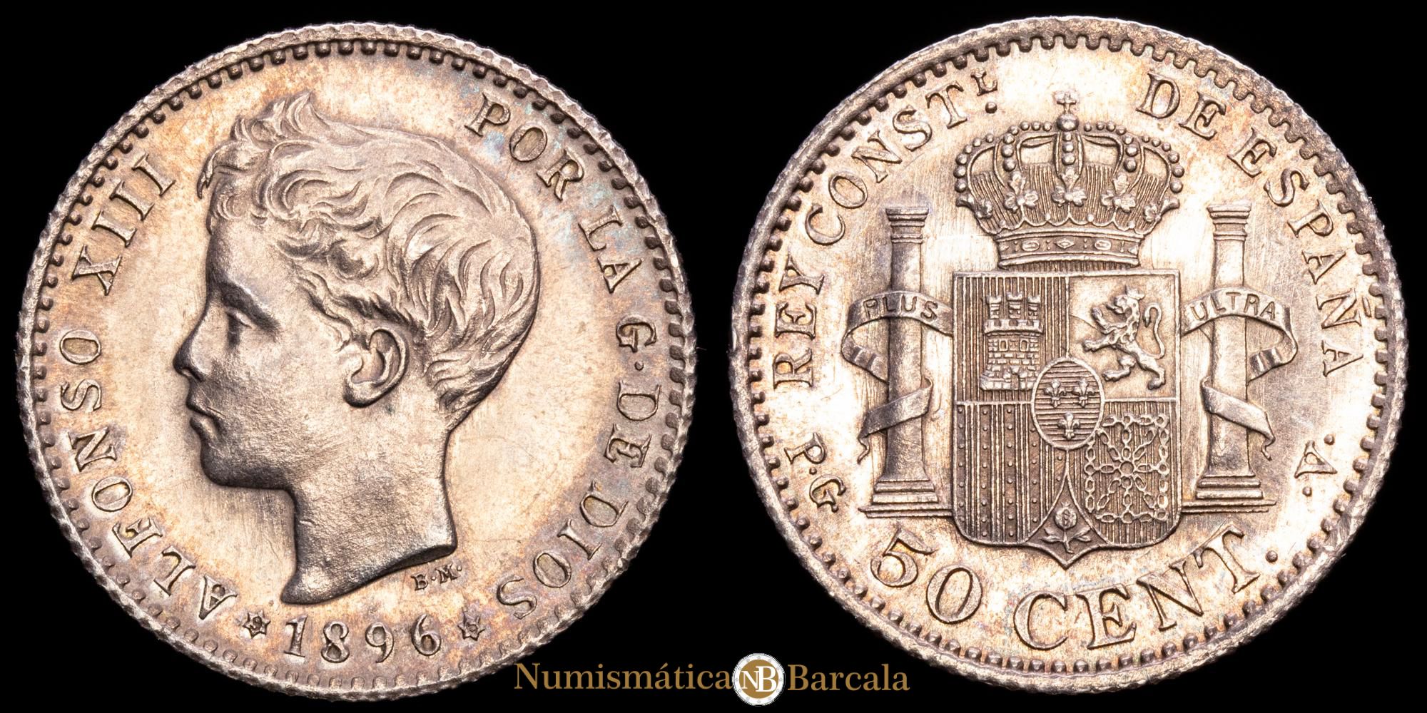 Alfonso XIII. 50 Céntimos (2,45 g.). Madrid. 1896 *9-6*. Ensayador PG·V. AC-44. UNC. Patina. Restos de brillo original.