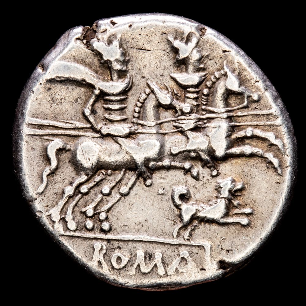 Numismática Barcala > Productos > Romanas > REPÚBLICA > Antesia. Denario. (3,93g.). Roma. 146 a.C. Craw-219/AE. VF+. Perro debajo debajo de los dioscuros.