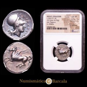 Sicilia, Siracusa. Timoleón y la Tercera Democracia. Stater (8,35 g.), 344-317 a.C. Pegaso 1. Encapsulada por la NGC, Ch VF