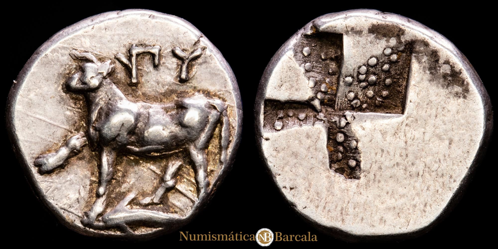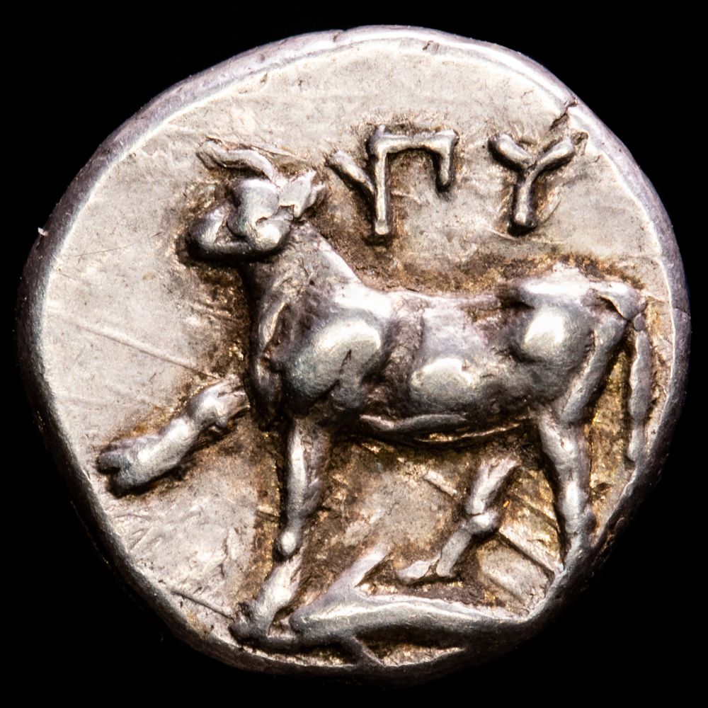 Numismática Barcala > Productos > Antigua Grecia > Antigua Grecia – Hemidracma (2,53 g.). Tracia-Byzantion, 340-320 a.C. AGC-3.2.1390. VF+. Toro caminando sobre delfín.