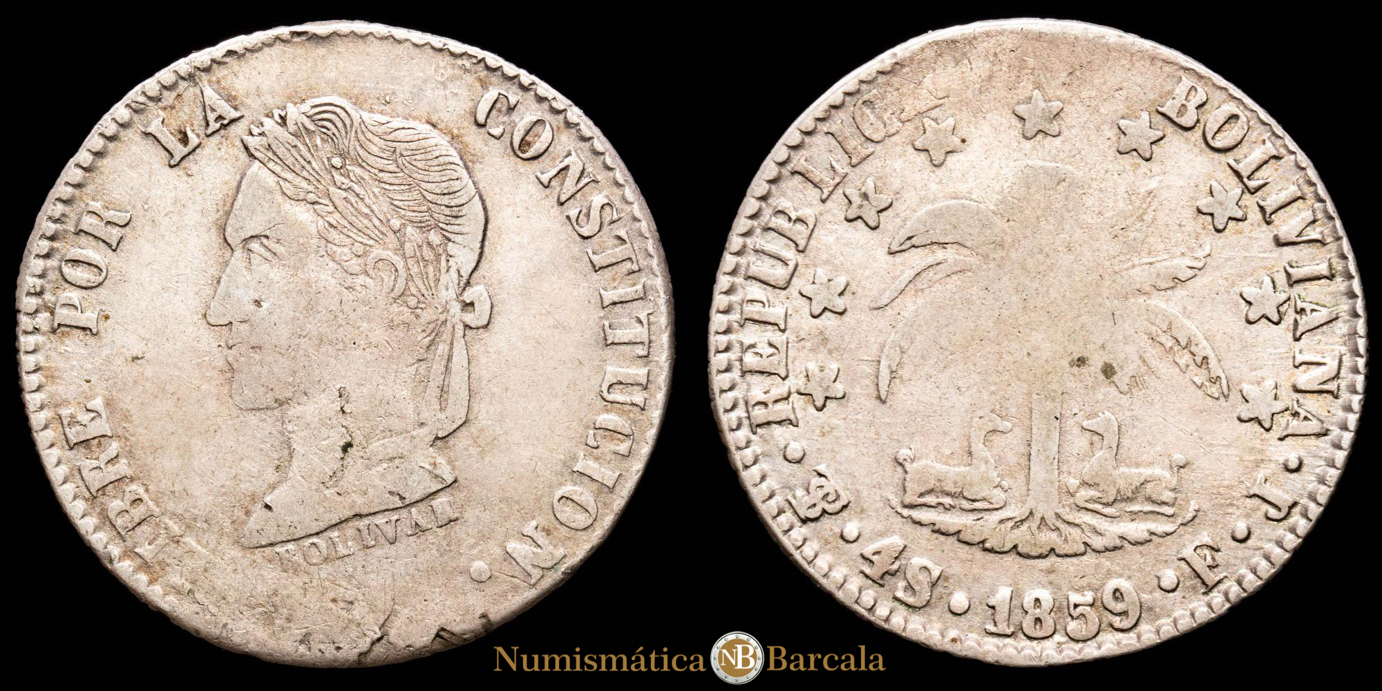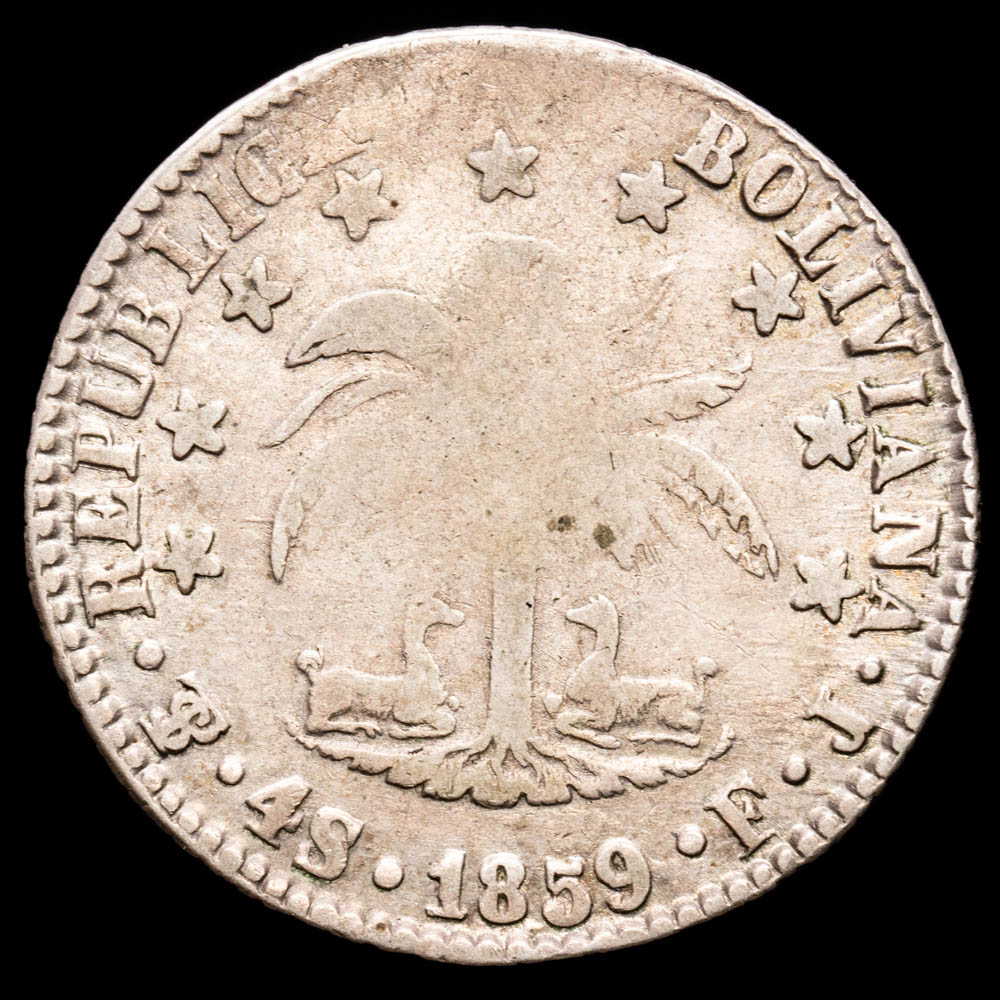 Numismática Barcala > Productos > Monedas Mundiales > America Sur > Bolivia > Bolivia. 4 Soles. (13,64 g.). Potosí. 1859. Ensayador F·J. KM-123.3. VF. La A de Bolivar es una V invertida
