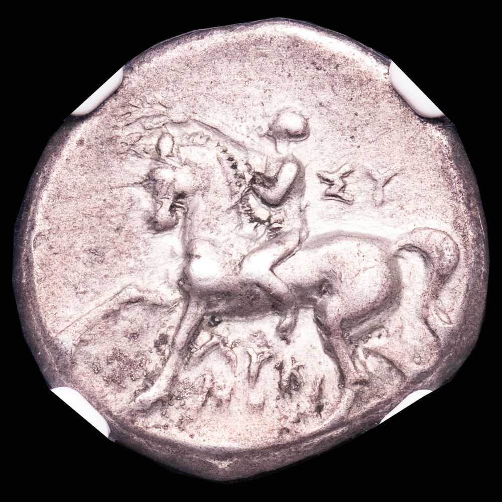 Numismática Barcala > Productos > Antigua Grecia > Calabria. Taras. Didracma (6,52 g.) 281-240 a.C. Vlasto 834. Encapsulada por la NGC; Ch VF 4/5 – 3/5.