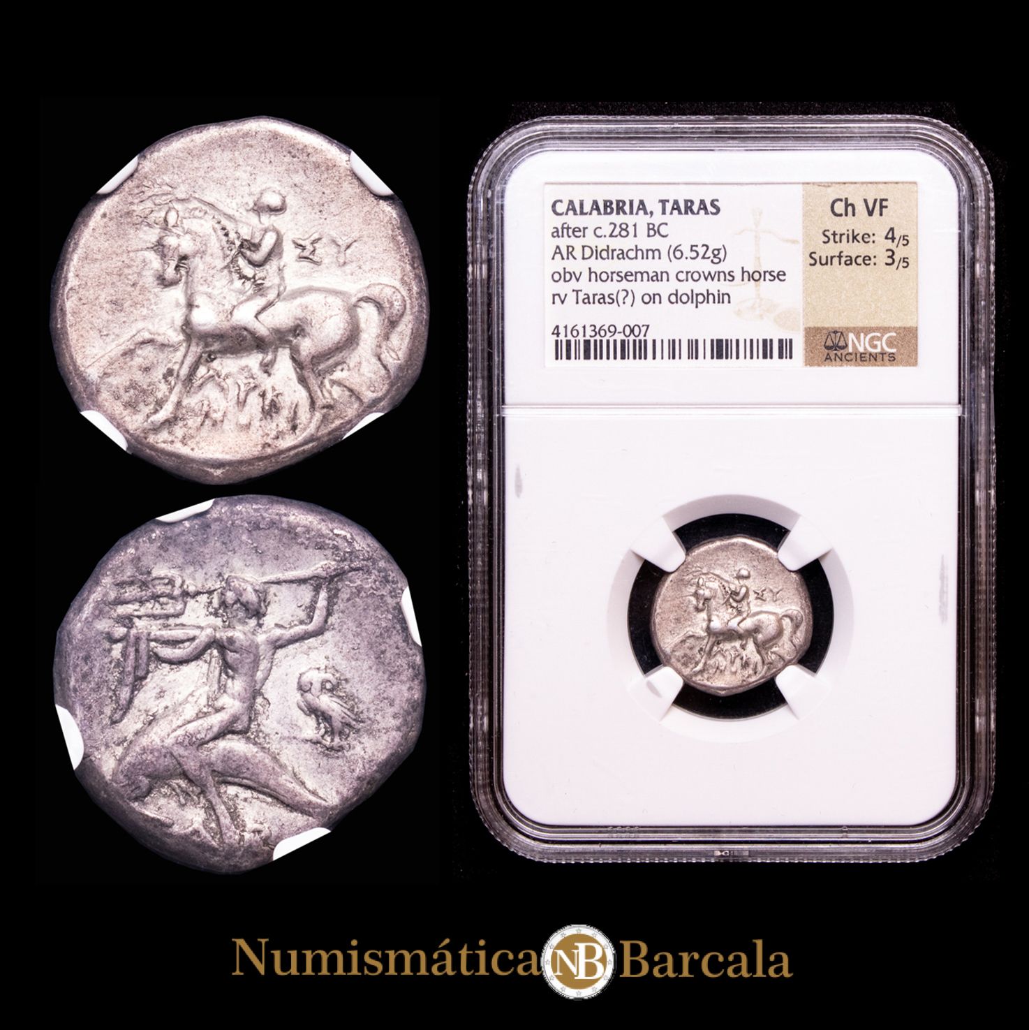 Calabria. Taras. Didracma (6,52 g.) 281-240 a.C. Vlasto 834. Encapsulada por la NGC; Ch VF 4/5 – 3/5.