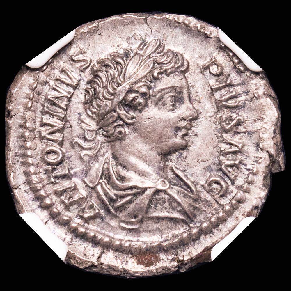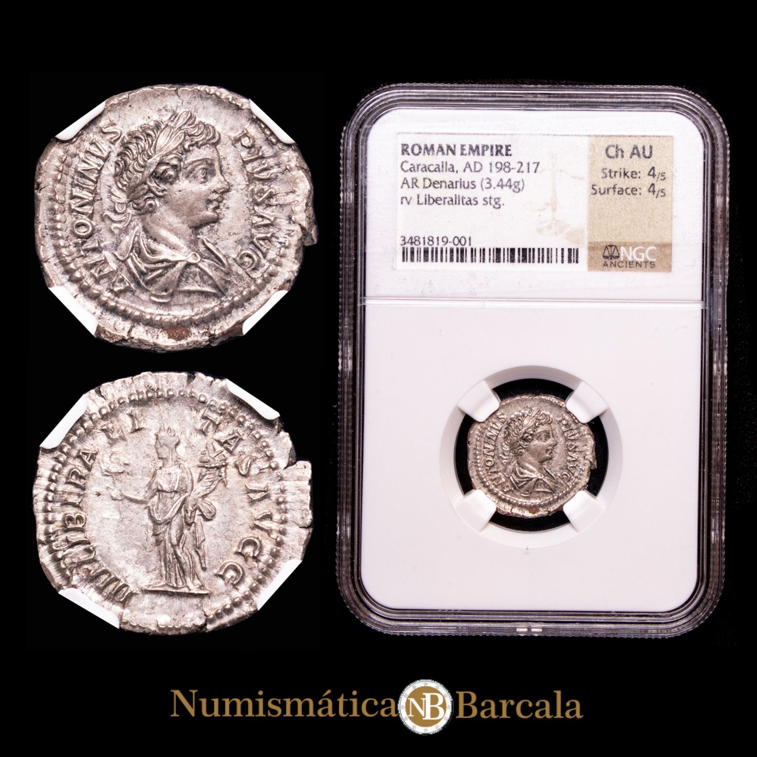 Numismática Barcala > Productos > Romanas > IMPERIO ROMANO > Alto Imperio > 193 - 238 d.C > Caracalla > Caracalla. Denario (3,44 g.). Roma, 201-206. Cy37. Ch122. RIC135. Encapsulada por la NGC, Ch AU.