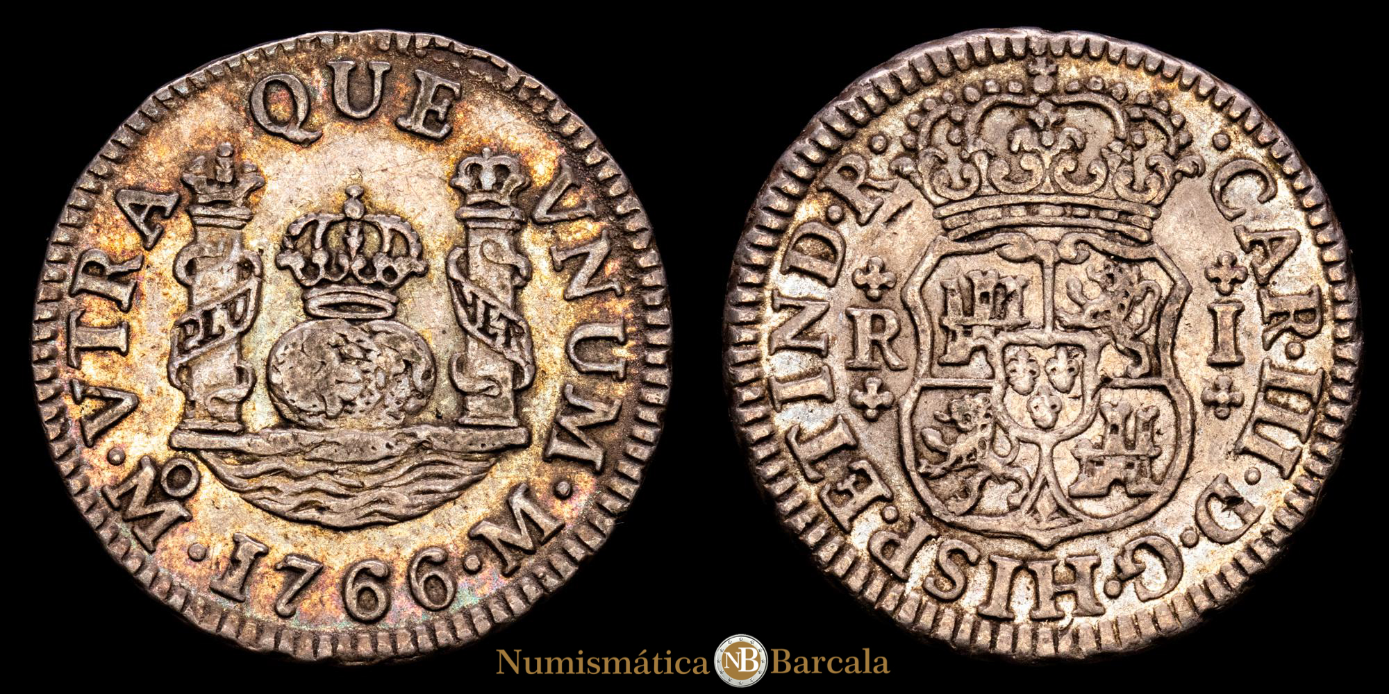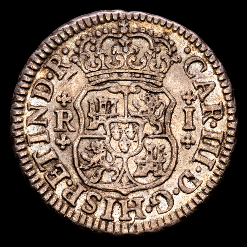 Carlos III. 1 Real. (3,44 g.). México. 1766. Ensayador M. Aureo y Calicó-416. MBC+. Escasa. Parte de brillo original . Tono . Muy bella pátina .