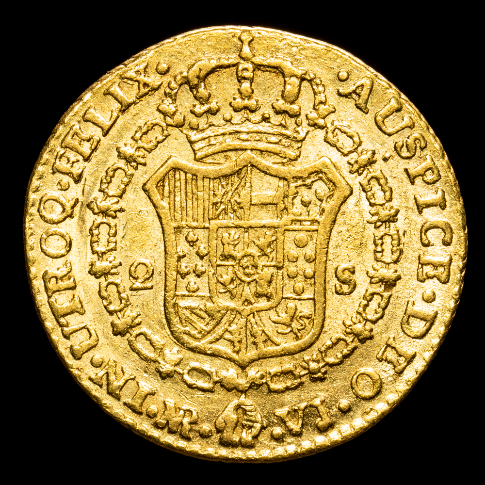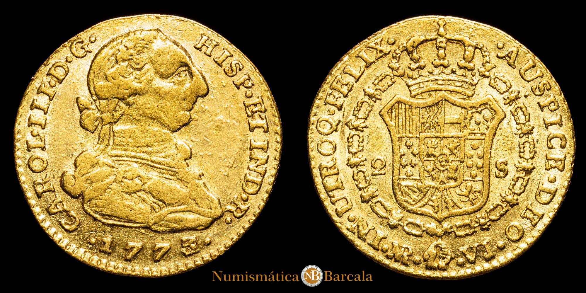 Carlos III. 2 Escudos. (6,76 g.). Nuevo Reino. 1773/2. Ensayador V·J. AC-1686. MBC+. Escasa.