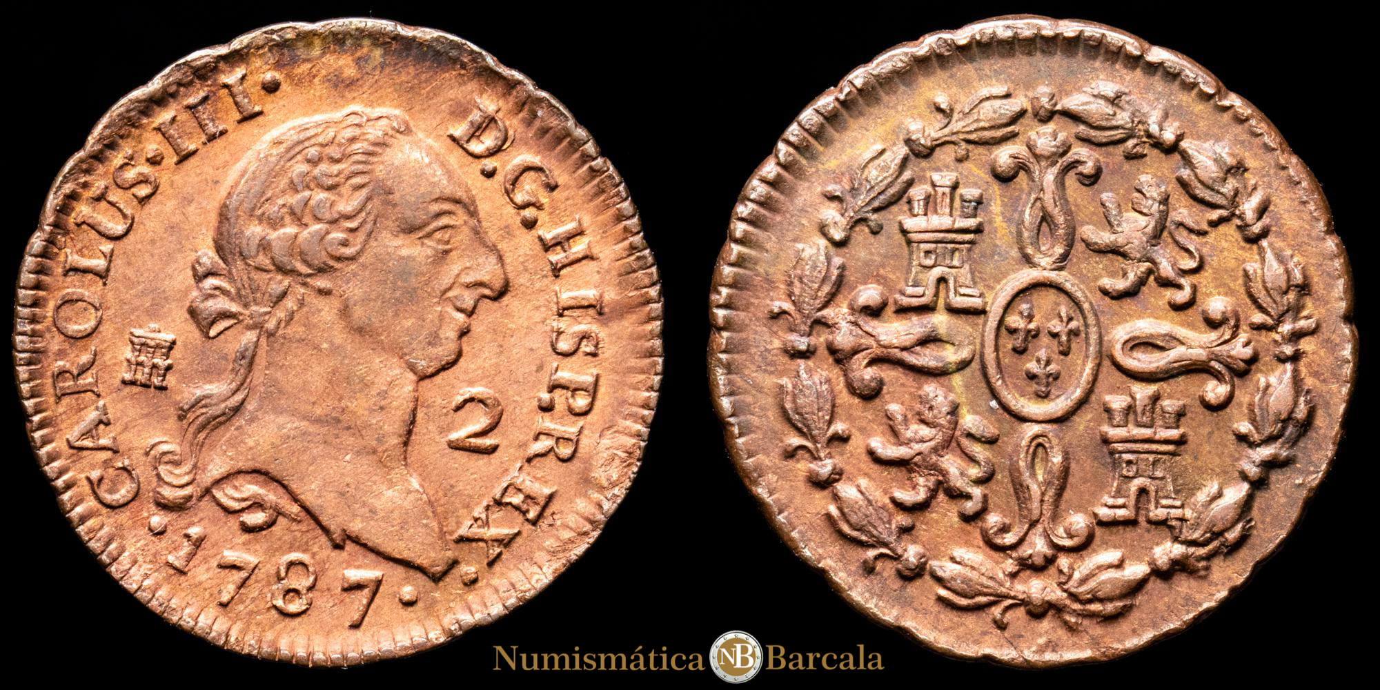 Carlos III. 2 Maravedís. (2,35 g.). Segovia. 1787. Aureo y Calicó 46. EBC.