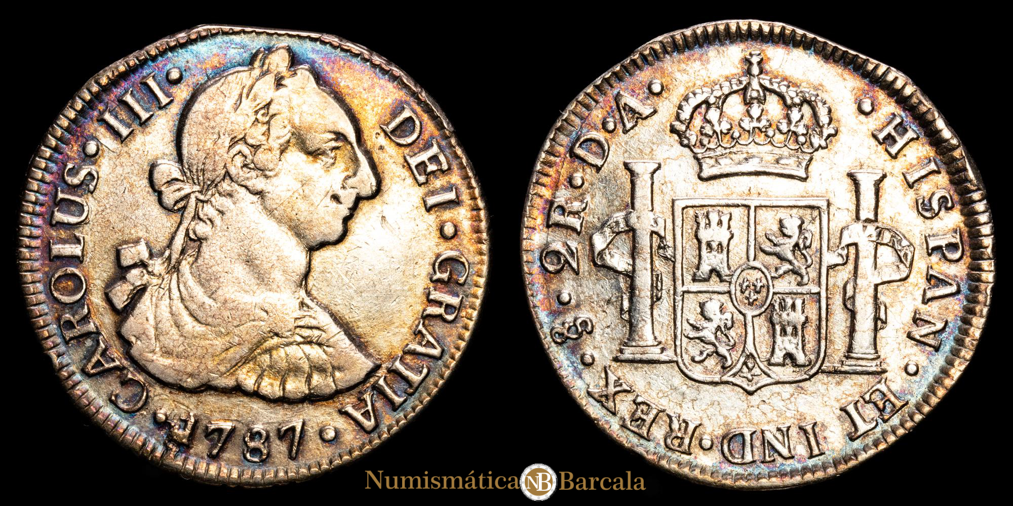 Carlos III. 2 Reales. (6,61g.). Santiago. 1787. Ensayador D.A. AC-768. MBC. Muy rara.
