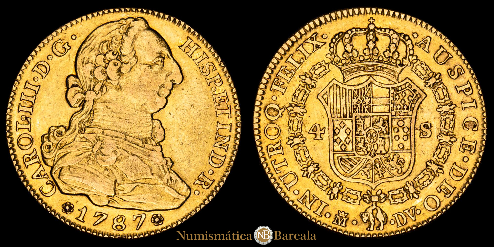 Carlos III. 4 Escudos. (13,42 g.). Madrid. 1787. Ensayador D·V. AC-1783. MBC+/EBC. Restos de brillo original.