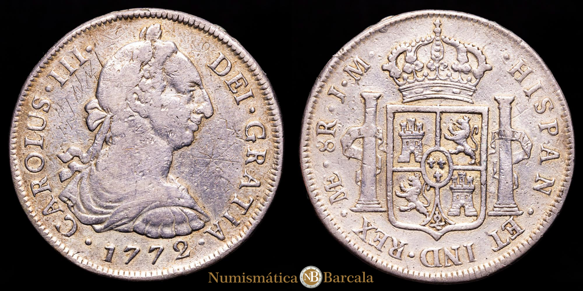 Numismática Barcala > Productos > Monarquia Española > Borbones > 1759-1788 Carlos III > Carlos III. 8 Reales. (26,72 g.). Lima. 1772. Ensayador J·M. AC-1035. BC+. Canto parcialmente perdido. Estuvo en aro.