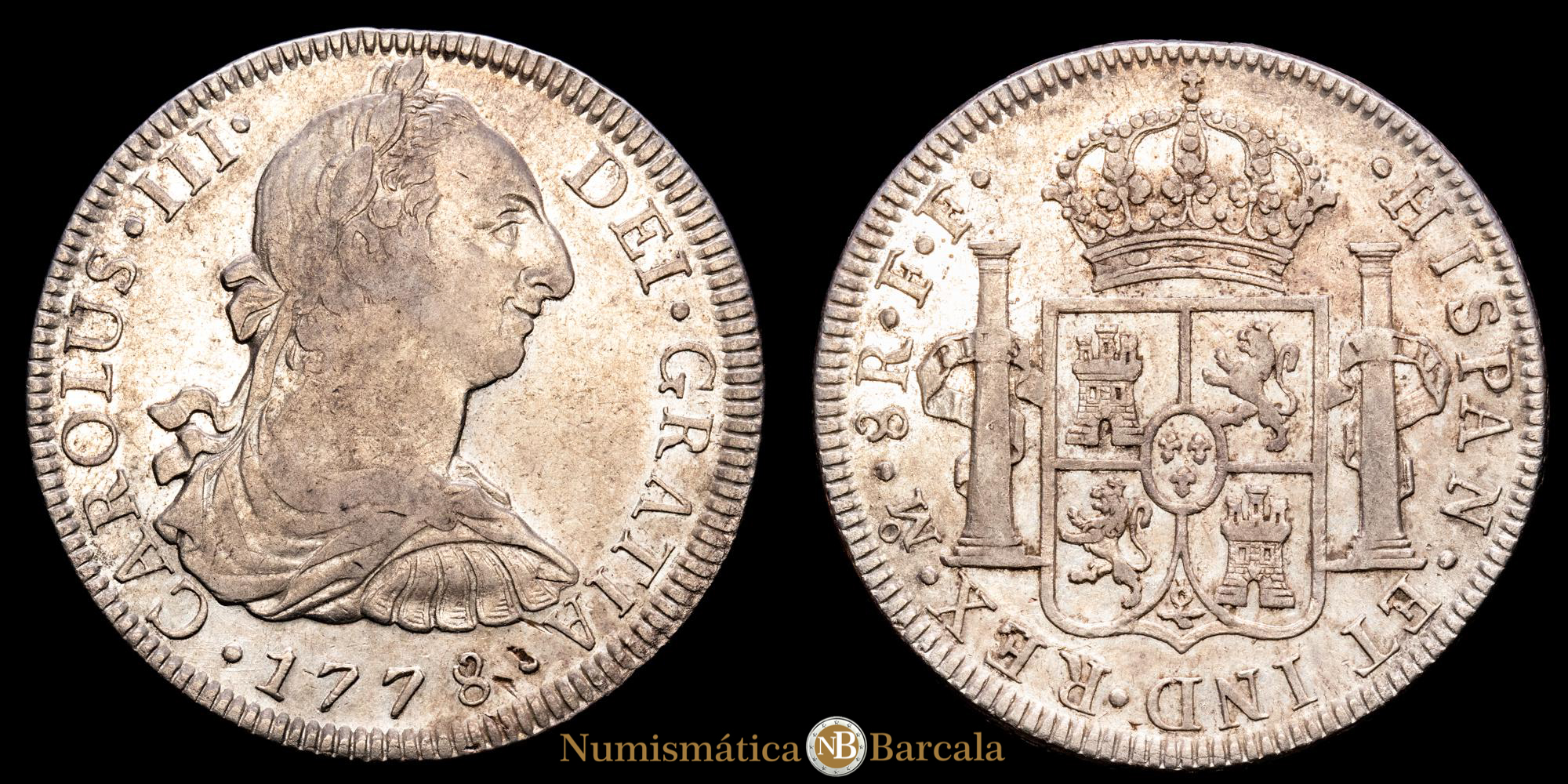 Carlos III. 8 Reales. (26,75 g.). México. 1778. Ensayador F·F. Aureo y Calicó-11717. MBC+. 40 mm. Restos de brillo original.