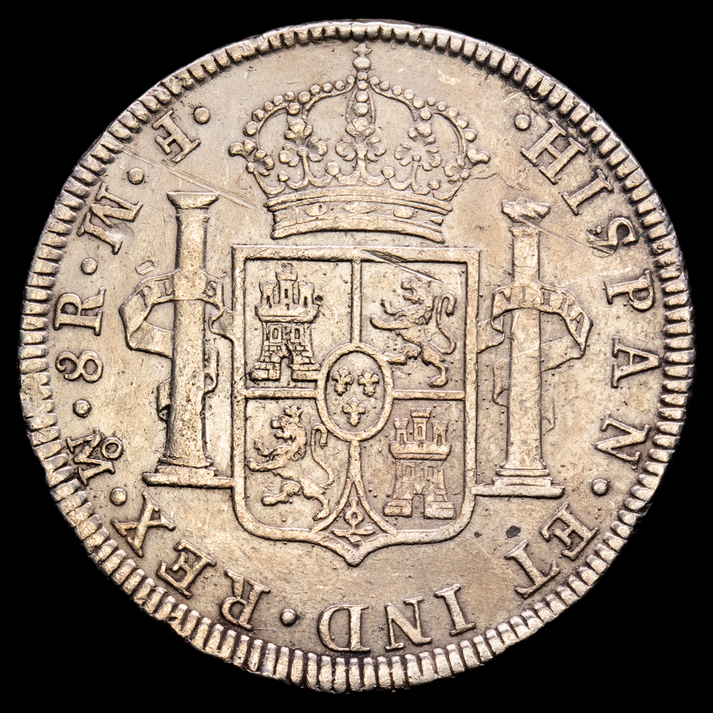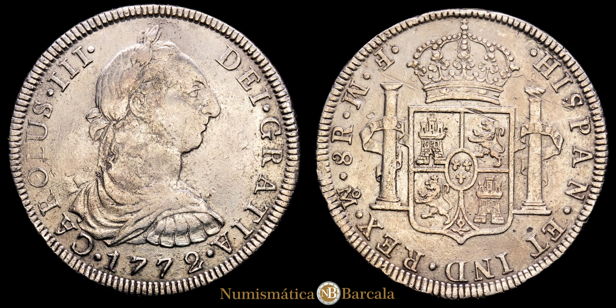 Numismática Barcala > Productos > Monarquia Española > Borbones > 1759-1788 Carlos III > Carlos III. 8 Reales. (26,78 g.). México. 1772. Ensayadores F·M. Aureo y Calicó – 1105. MBC+. Ceca invertida. Oxidaciones limpiadas