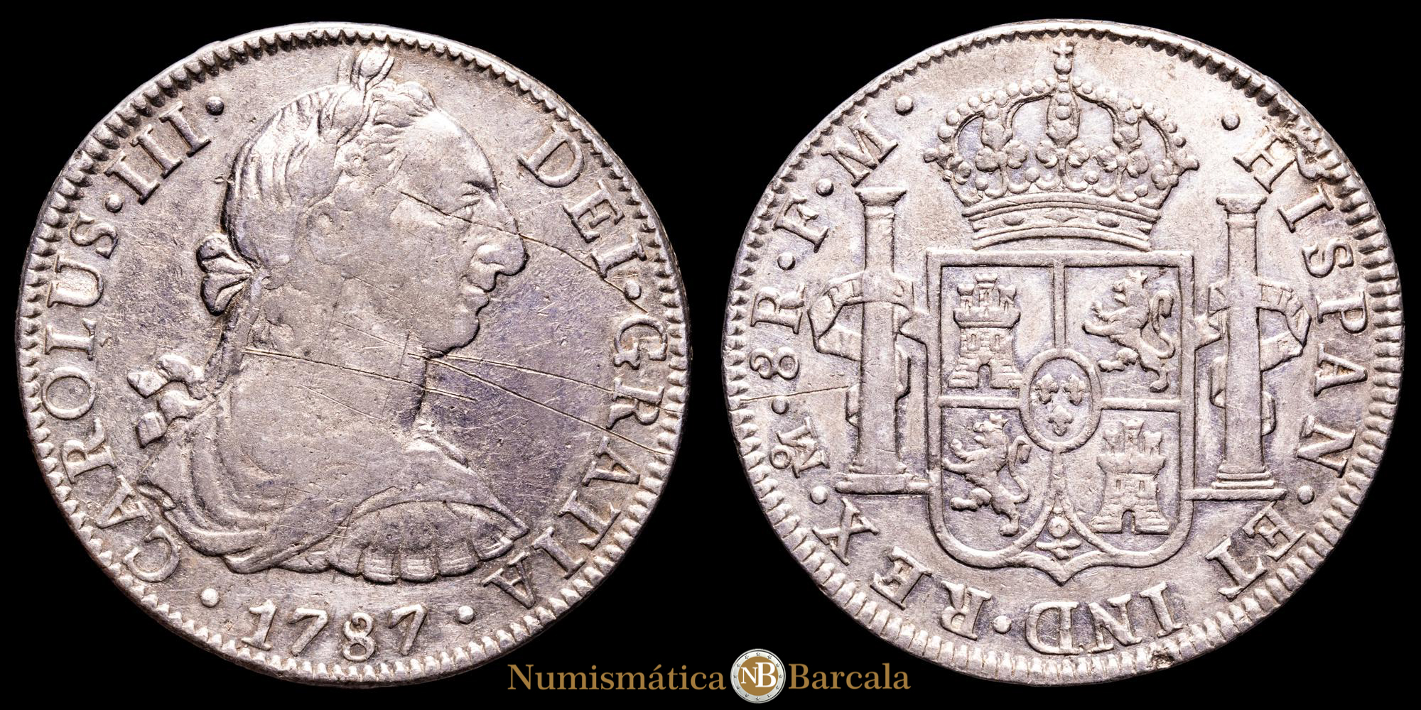 Carlos III. 8 Reales. (26,79 g.). México. 1787. Ensayador F·M. Aureo y Calicó-1131. MBC. Restos de brillo original. Rayas en anverso.