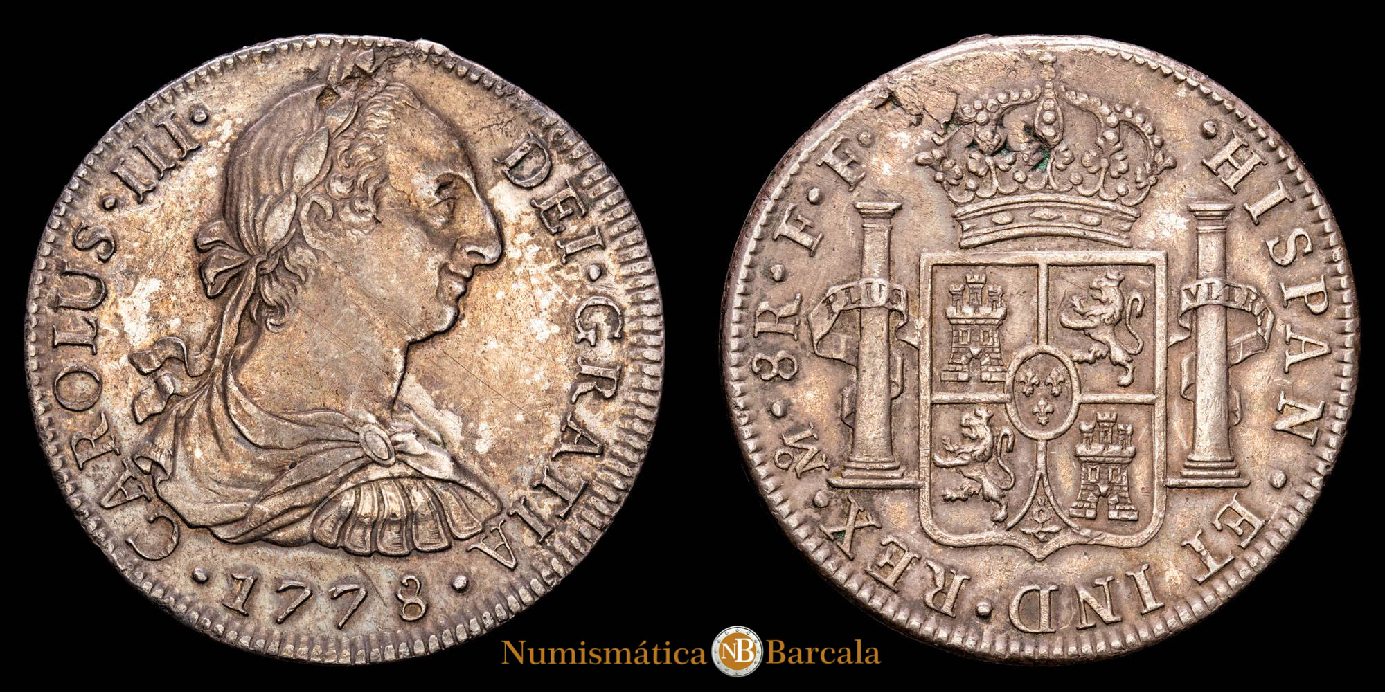 Carlos III. 8 Reales. (26,81 g.). México. 1778. Ensayador F·F. Aureo y Calico – 1117. MBC+. Pátina oscura.