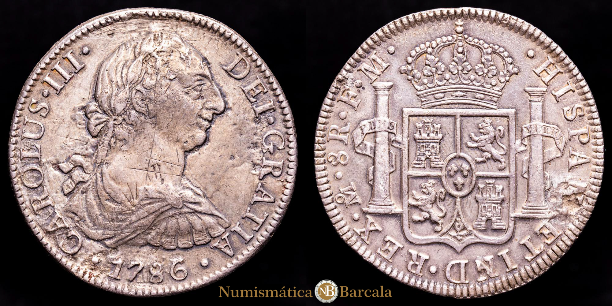 Carlos III. 8 Reales. (26,87 g.). México. 1786. Ensayador F·M. AC-1129. MBC+. Grafiti en anverso y restos de soldadura