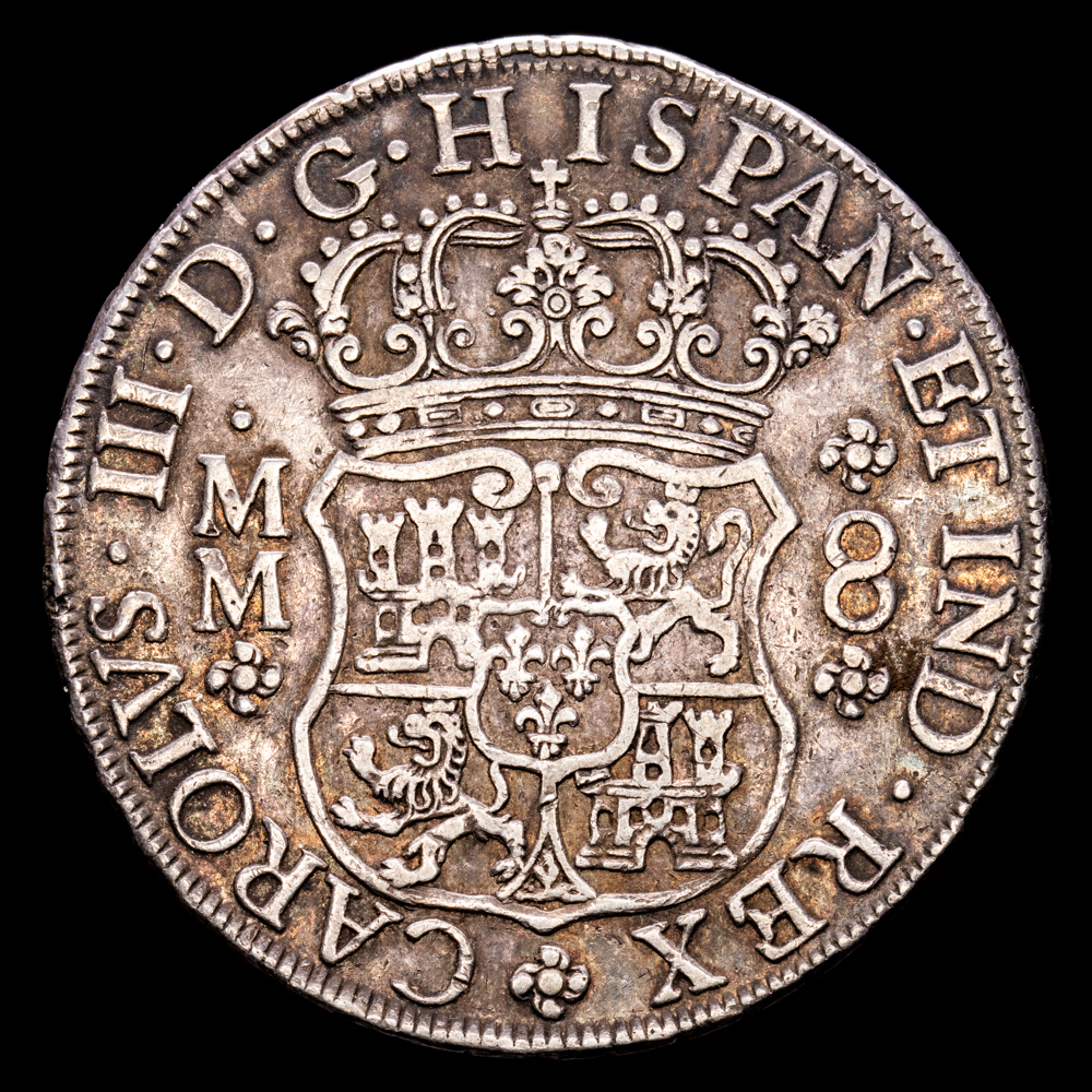 Carlos III. 8 Reales. (26,96 g.). México. 1761. Ensayador M·M. Aureo y Calicó – 1075. MBC+. Pátina. Pequeños golpecitos.