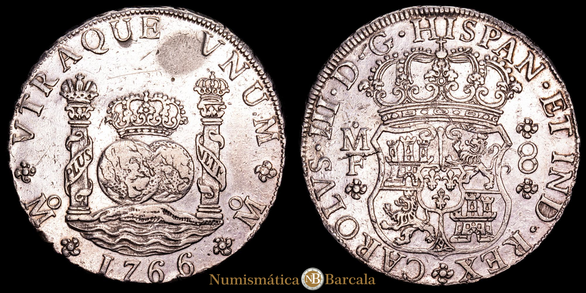Carlos III. 8 Reales. (26,97 g.). México. 1766. Ensayador M·F. Aureo y Calicó-1090. MBC+. Limpiada.