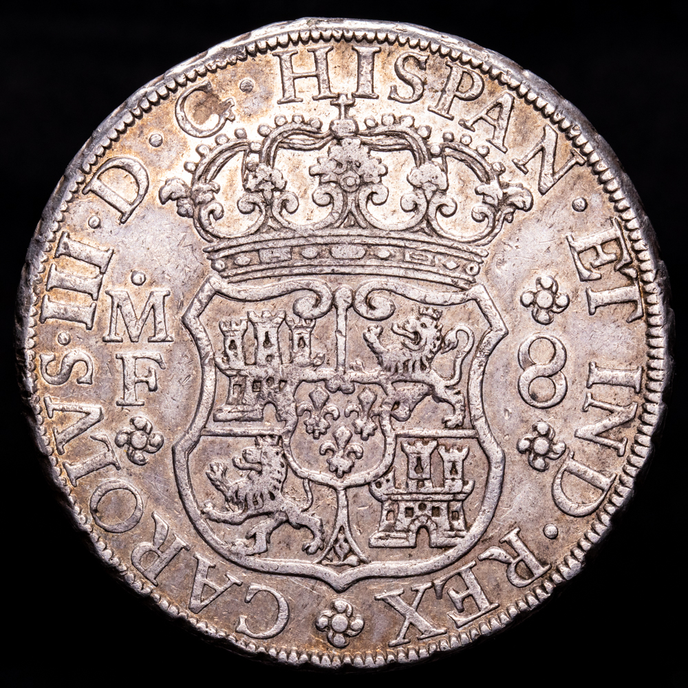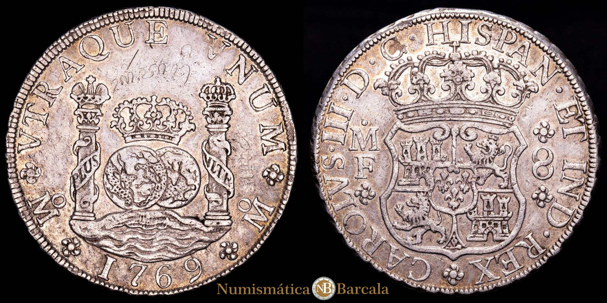 Carlos III. 8 Reales. (26,99 g.). México. 1769. Ensayador M·F. AC-1095. EBC-. Curioso graffiti en anverso en forma de firma.