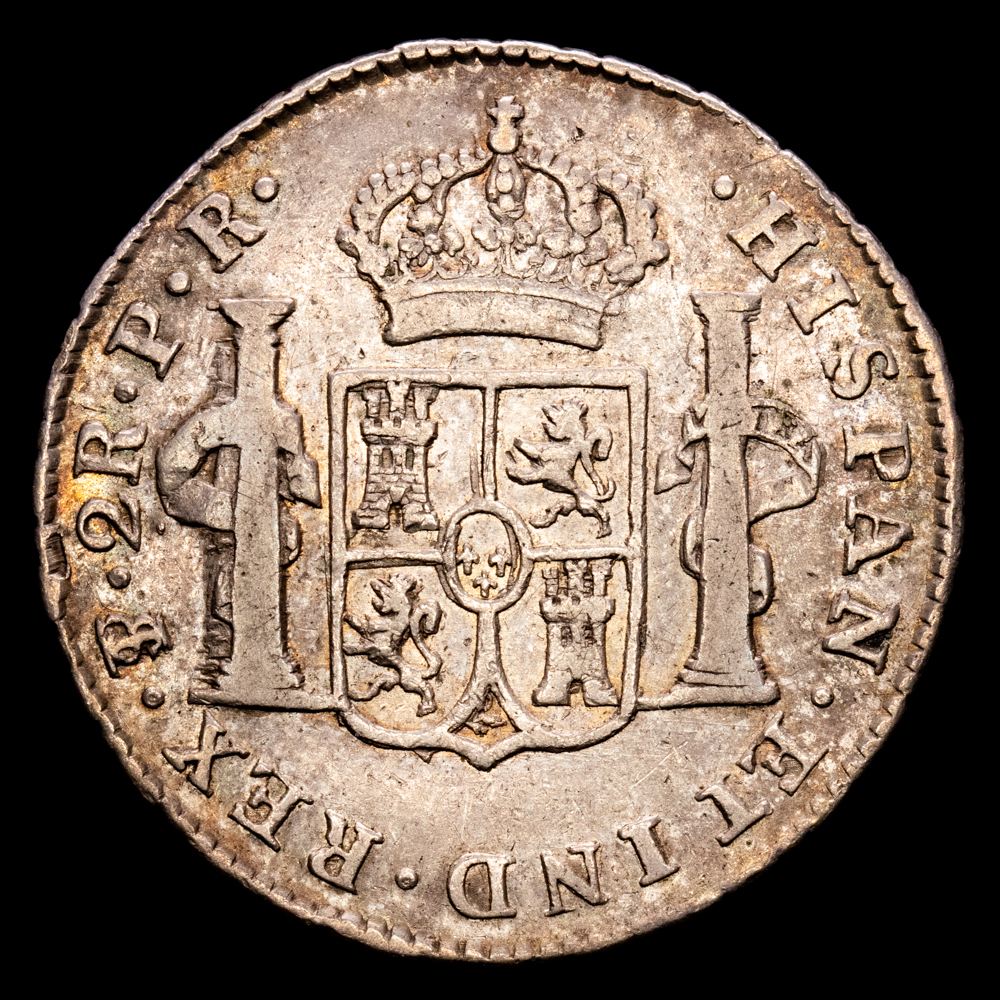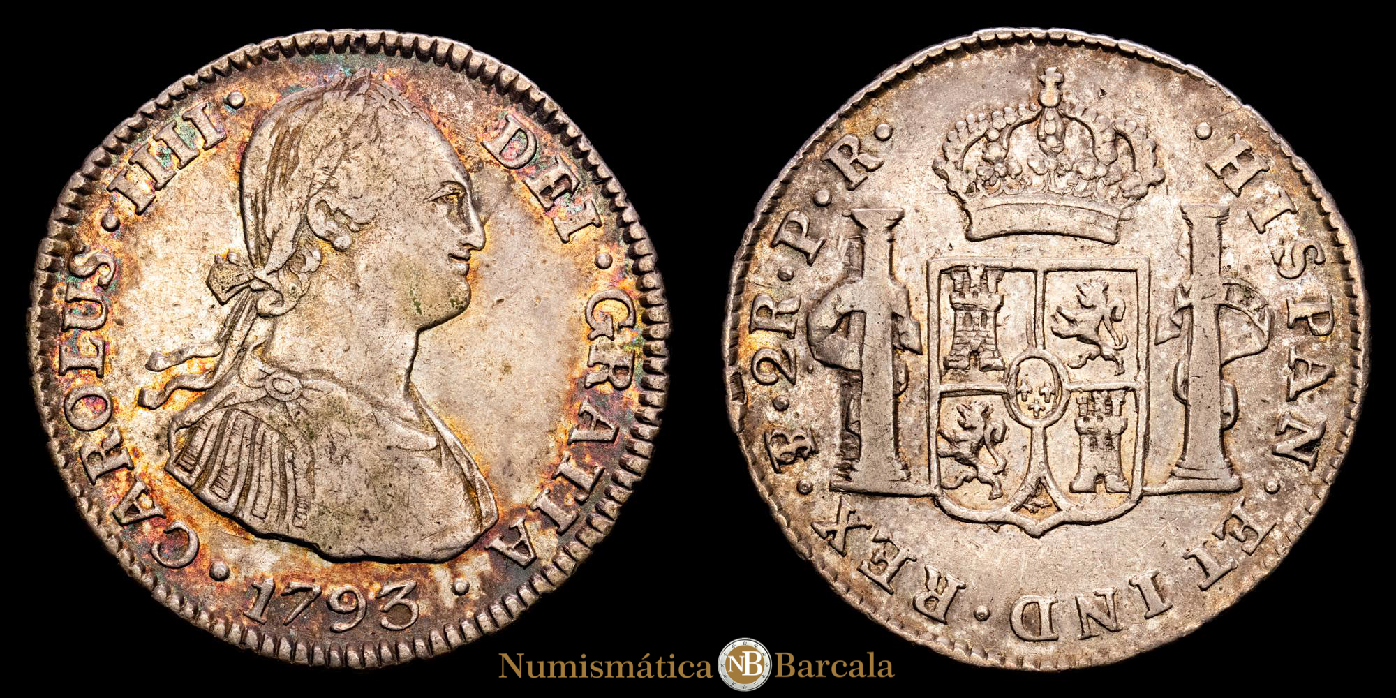 Carlos IIII. 2 Reales. (6,63 g.). Potosí. 1793. Ensayador P·R. MBC. Escasa. Pátina.
