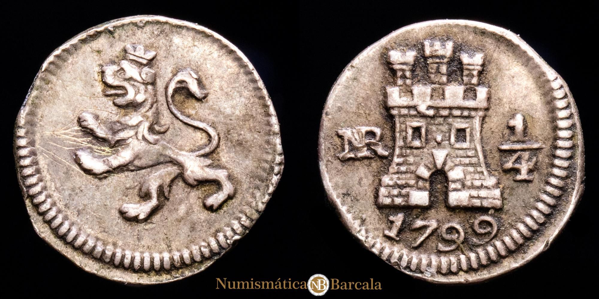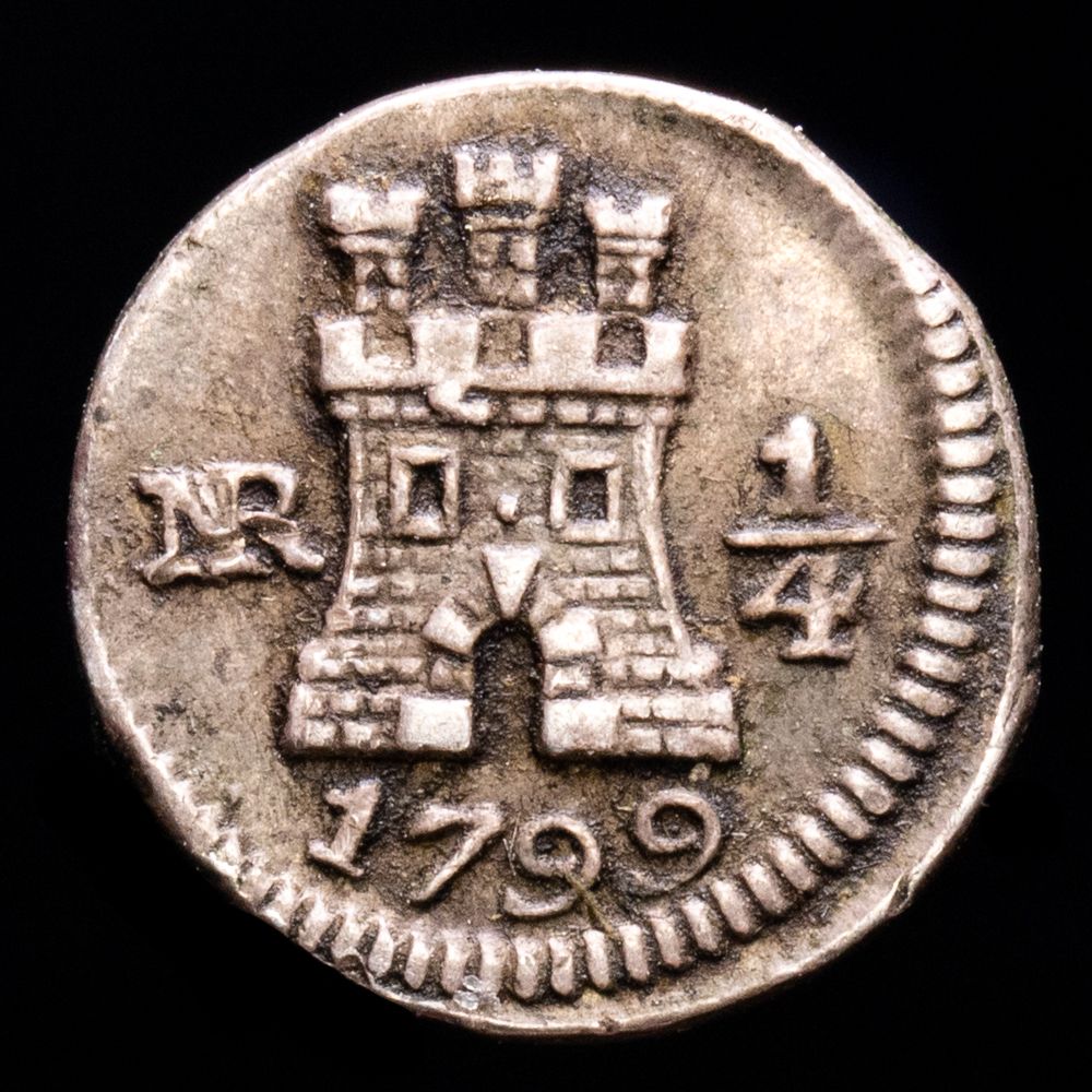 Carlos IV. 1/4 Real (0,84 g.). Santa Fe de Nuevo Reino (Colombia). 1799. AC-167. MBC+. Escasa, buen ejemplar.