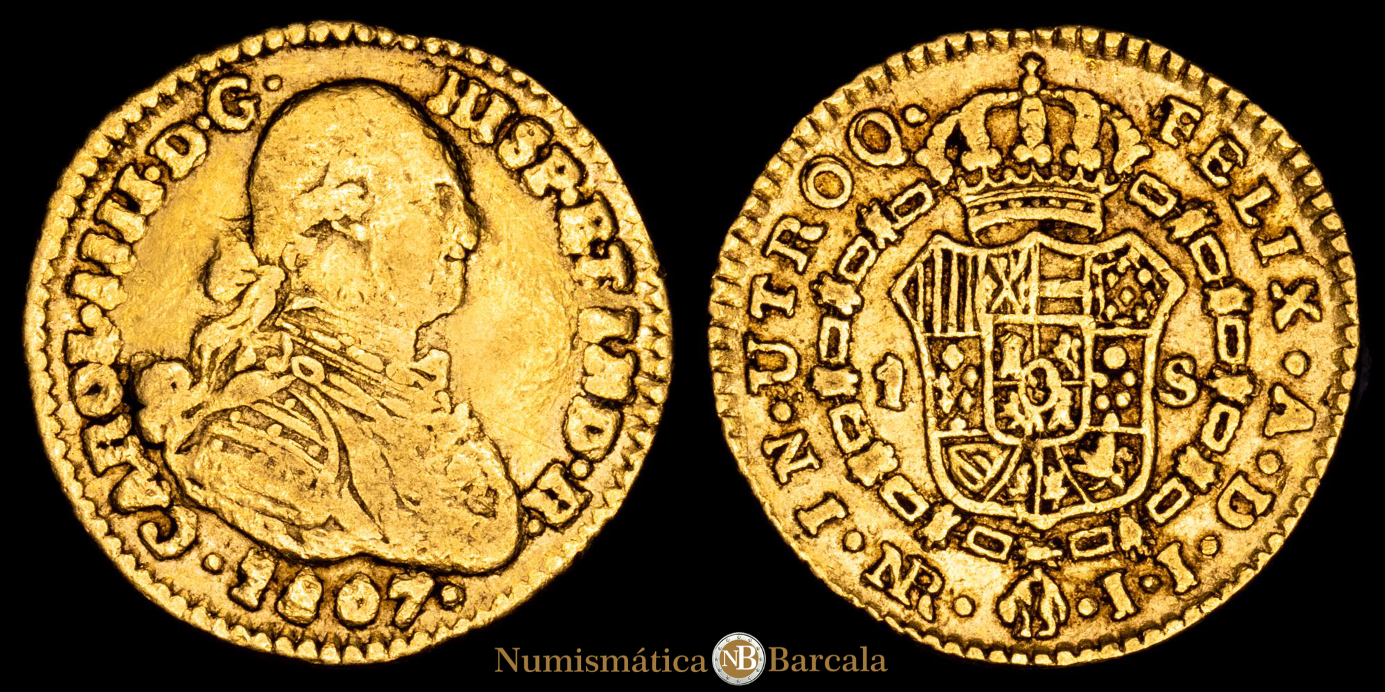 Numismática Barcala > Productos > Monarquia Española > Borbones > 1788-1808 Carlos IV > Carlos IV. 1 Escudo. (3,3 g.). Nuevo Reino. 1807. Ensyador J·J. AC-1222. MBC. Rara, pocos ejemplares conocidos