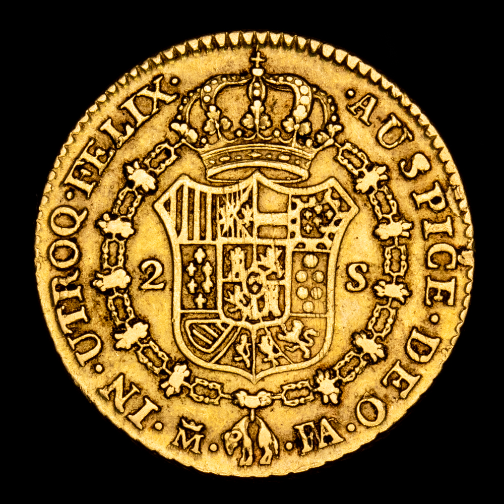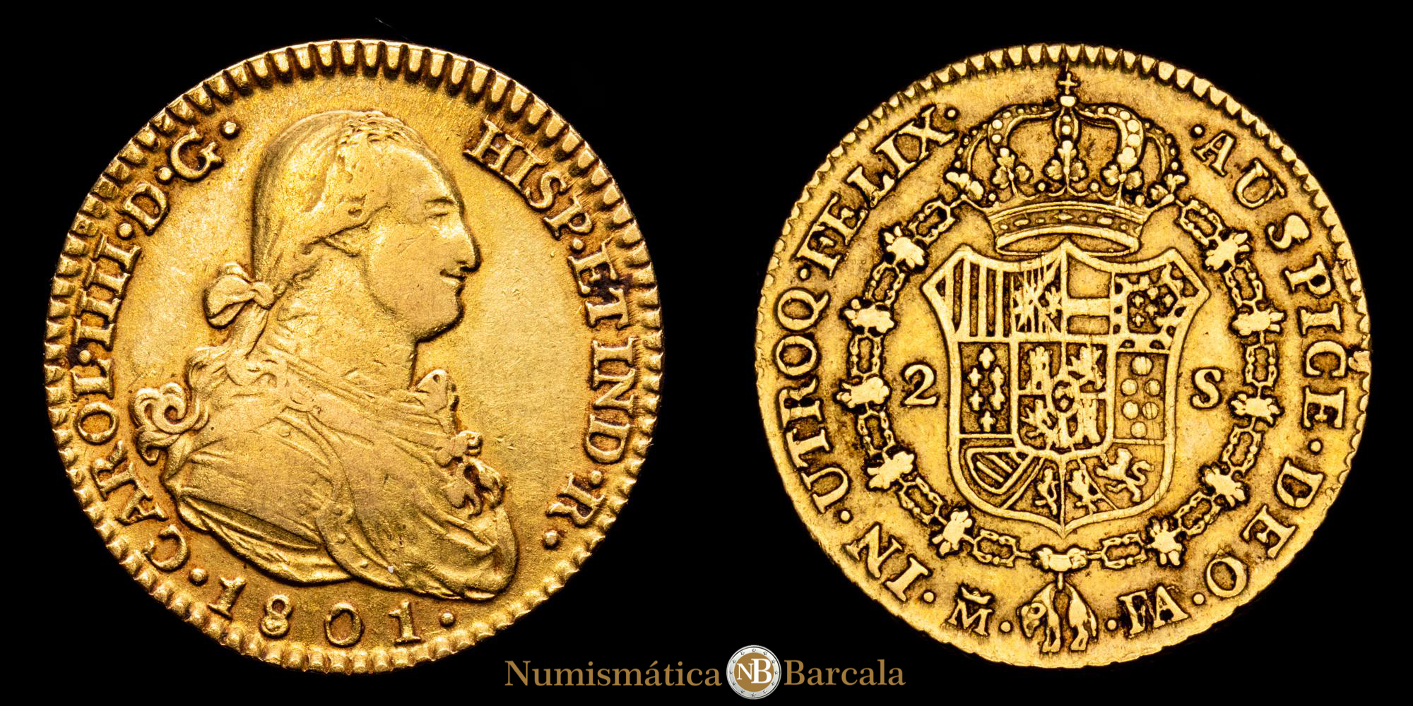 Numismática Barcala > Productos > Monarquia Española > Borbones > 1788-1808 Carlos IV > Carlos IV. 2 Escudos. (6,71 g.). Madrid. 1801. Ensaador FA/MF. Aureo y Calico-1302. MBC.