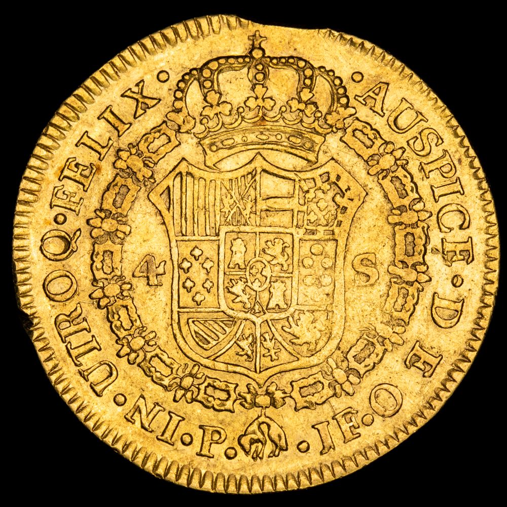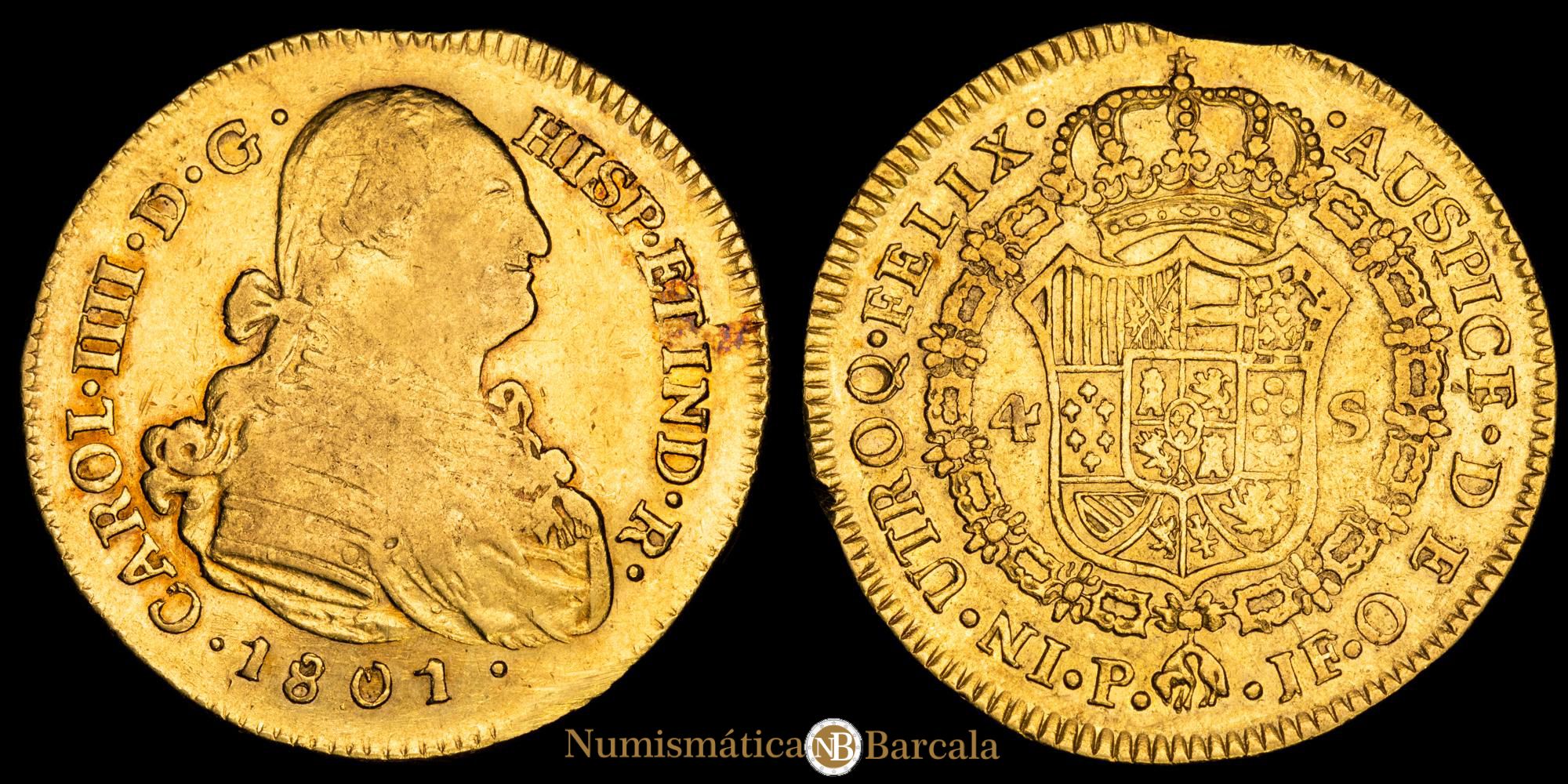 Carlos IV. 4 Escudos (13,40 g.). Popayán. 1801. Ensayador J·F. AC-1518. MBC/MBC+. Restos de brillo original. Rara, pocos ejemplares conocidos .