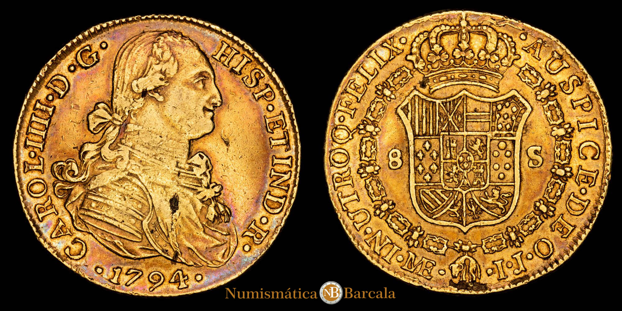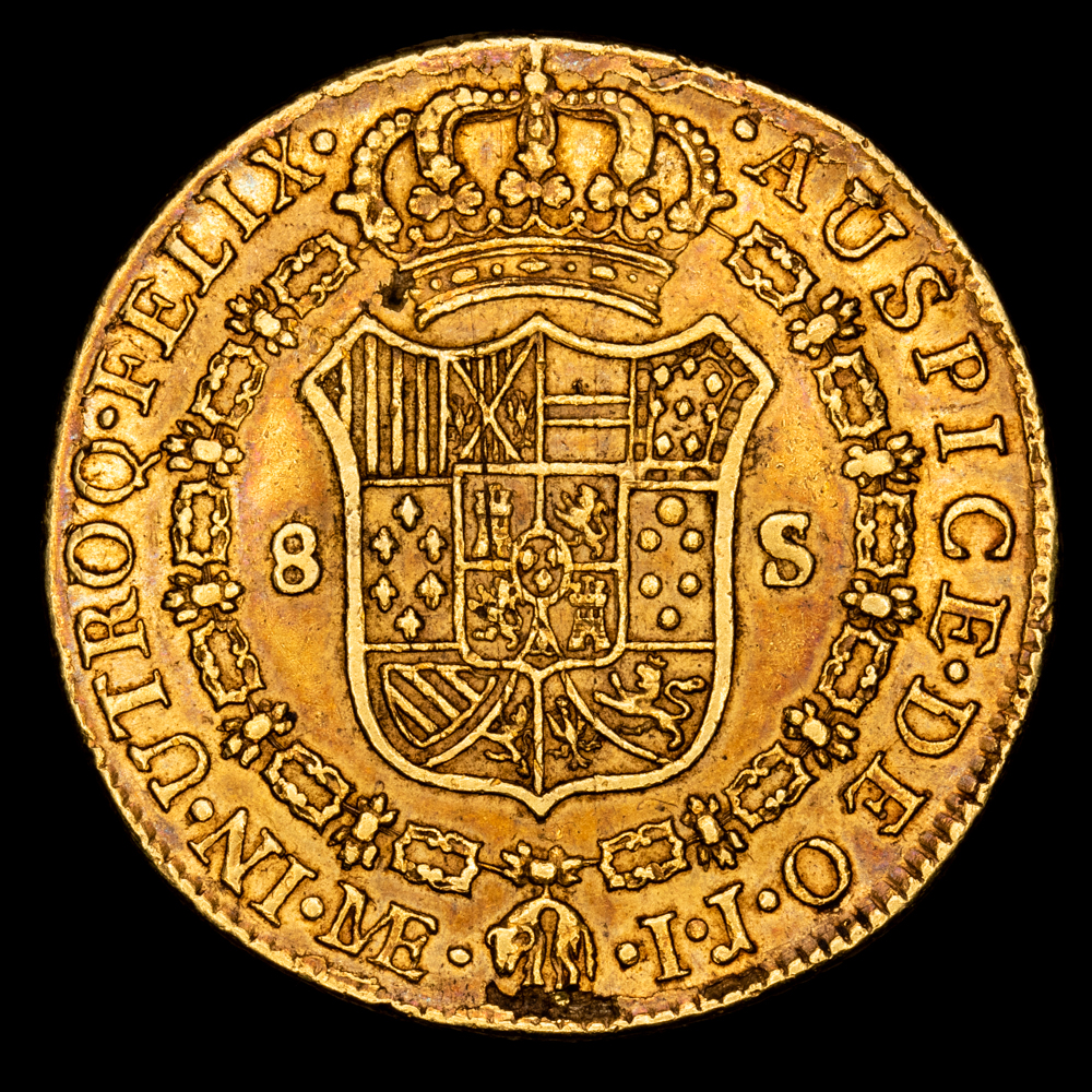 Carlos IV. 8 Escudos. (26,92 g.). Lima. 1794. Ensayador I·J. Aureo y Calico – 1593. MBC+. Bonito color