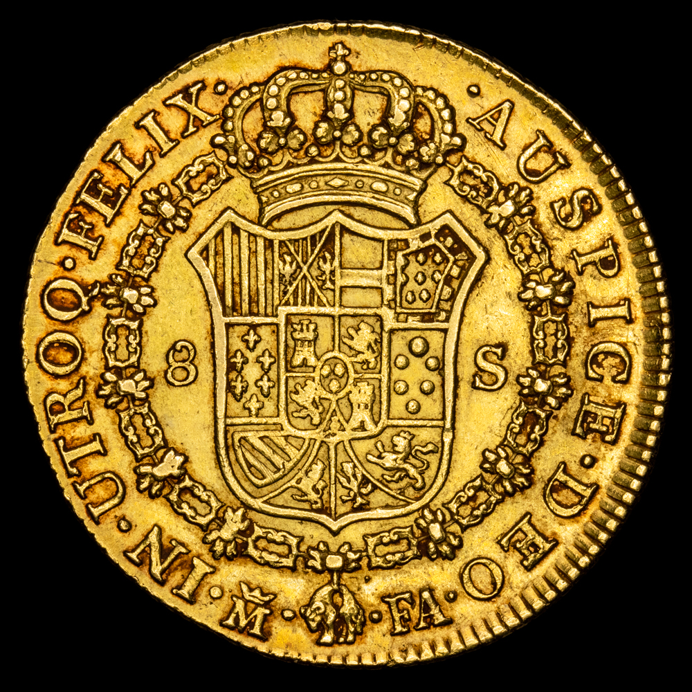 Numismática Barcala > Productos > Monarquia Española > Borbones > 1788-1808 Carlos IV > Carlos IV. 8 Escudos. (26,98 g.). Madrid. 1805. Ensayador FA/PJ. Aureo y Calicó-1626-var. MBC+/EBC. Parte de brillo original