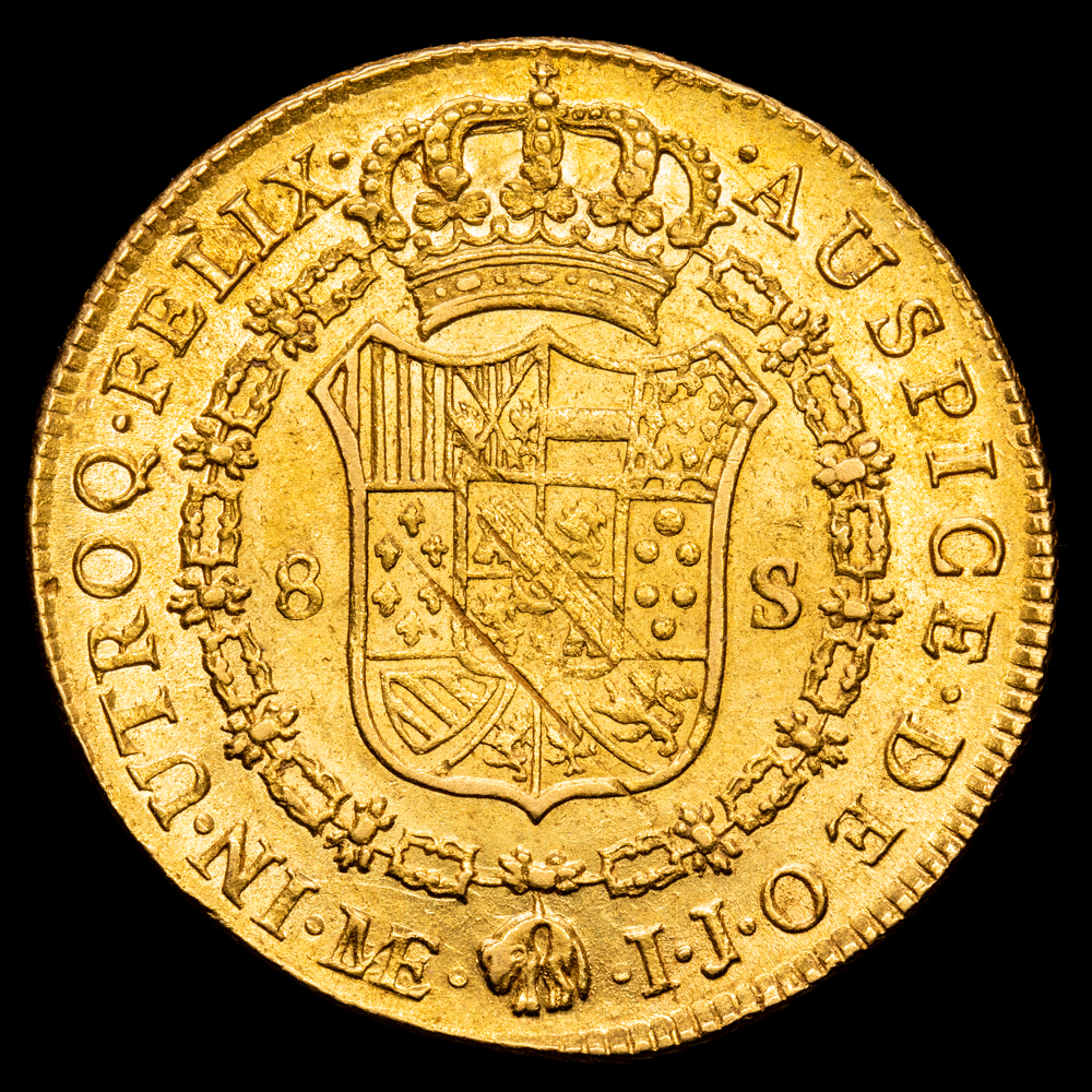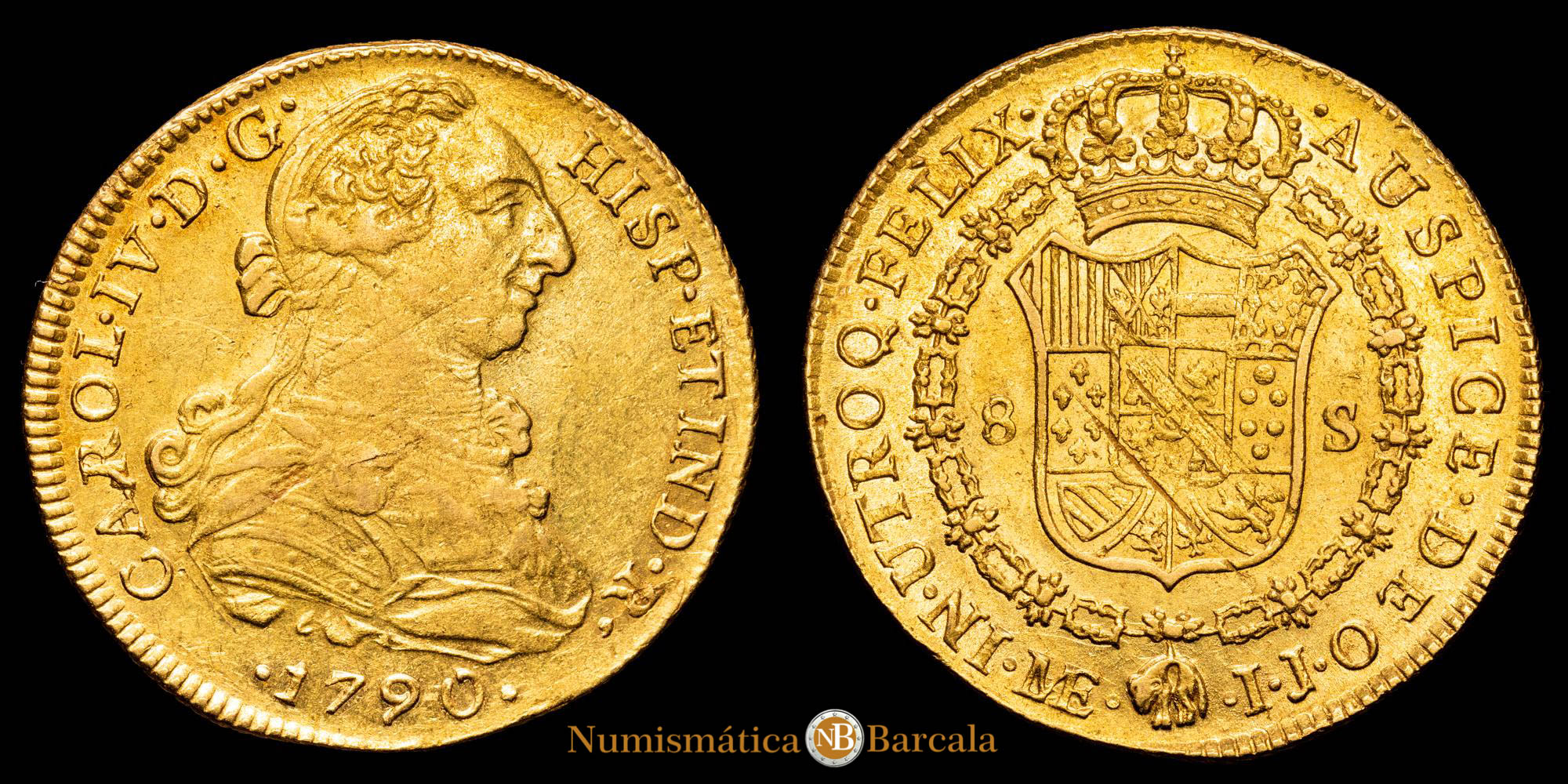 Numismática Barcala > Productos > Monarquia Española > Borbones > 1788-1808 Carlos IV > Carlos IV. 8 Escudos. (27,02 g.). Lima. 1790. Ensayador I·J. Aureo y Calico – 1589. MBC+/EBC. Restos de brillo original. Busto de Carlos III ordinal Carlos IV