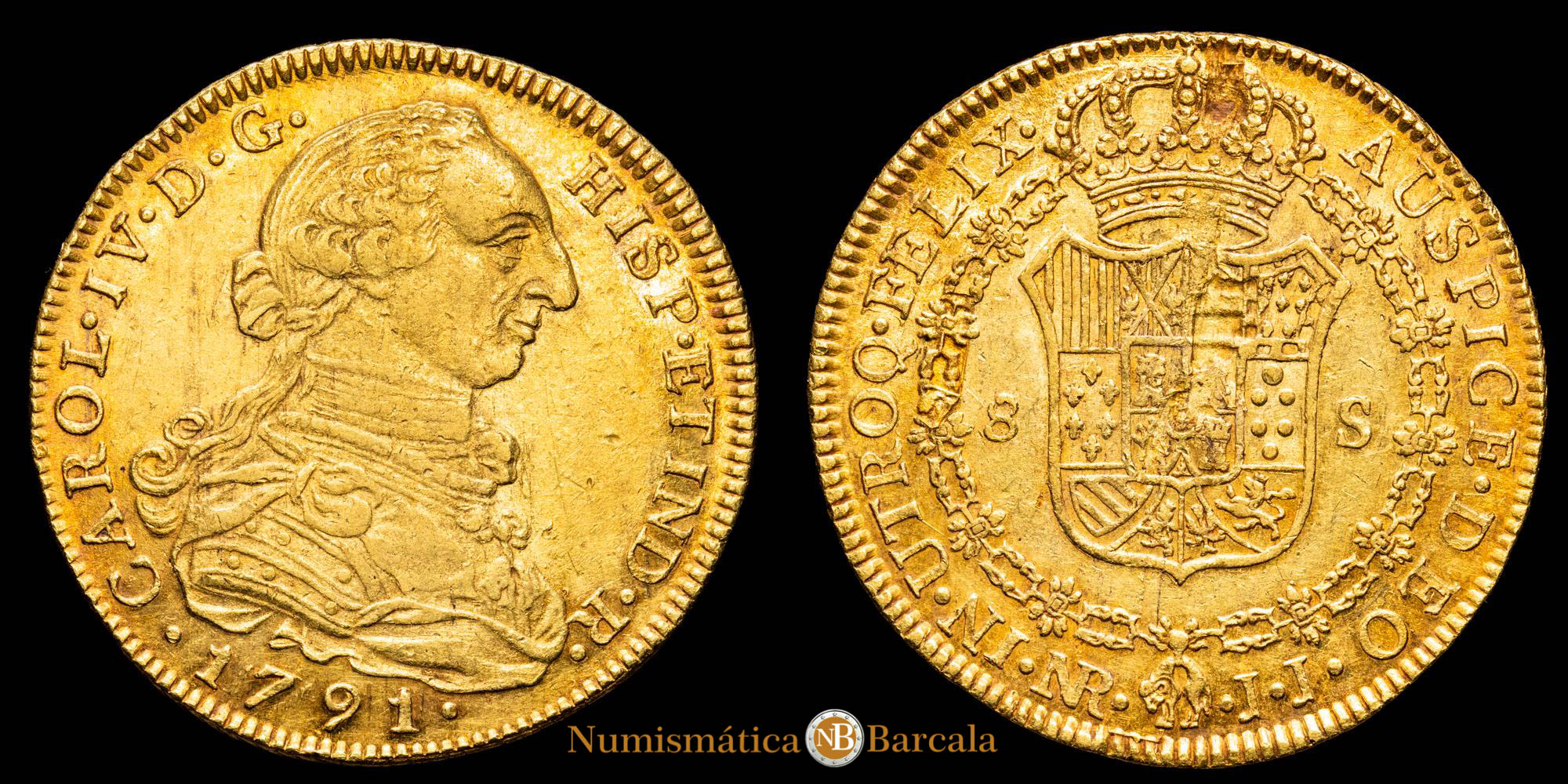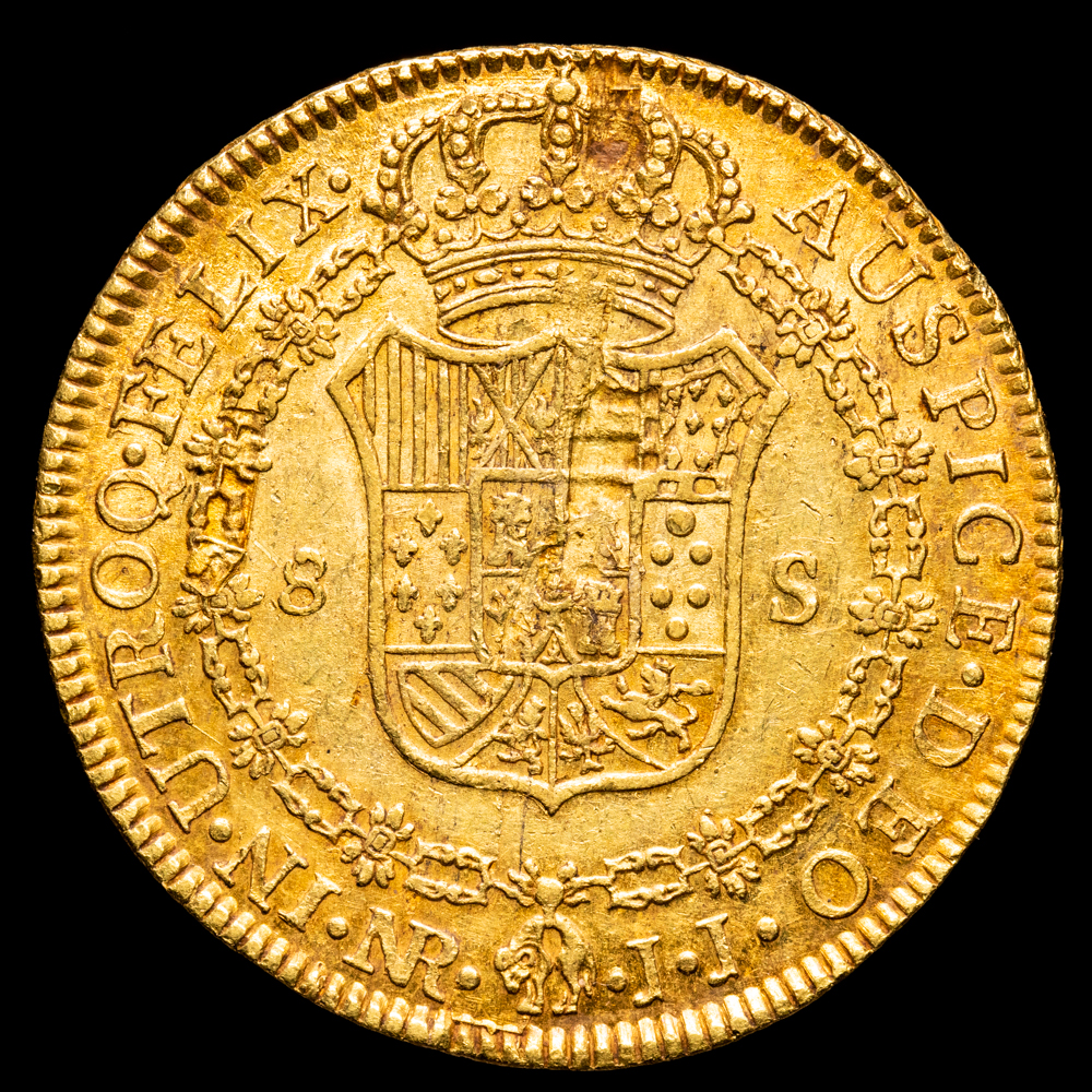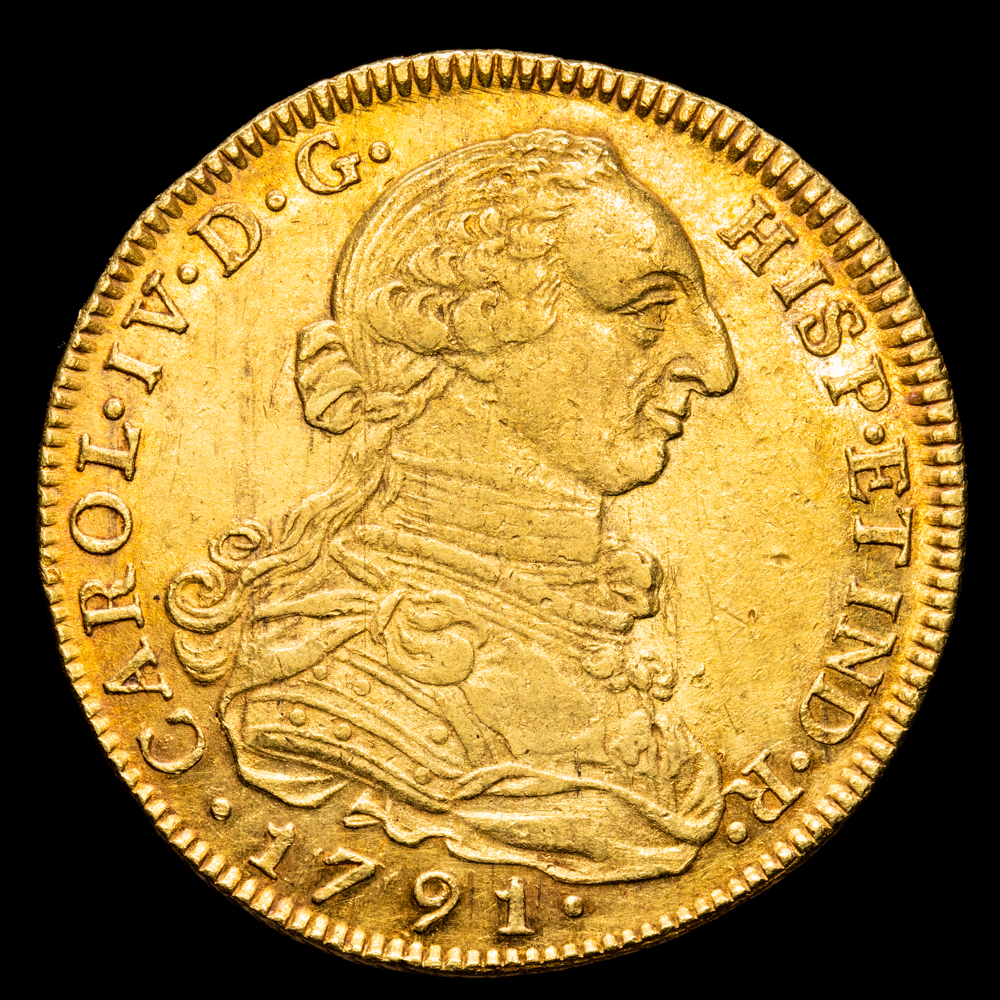 Numismática Barcala > Productos > Monarquia Española > Borbones > 1788-1808 Carlos IV > Carlos IV. 8 Escudos. (27,08 g.). Nuevo Reino. 1791. Ensayador J·J. Aureo y Calico – 1718. EBC-. Escasa. Bella pátina.