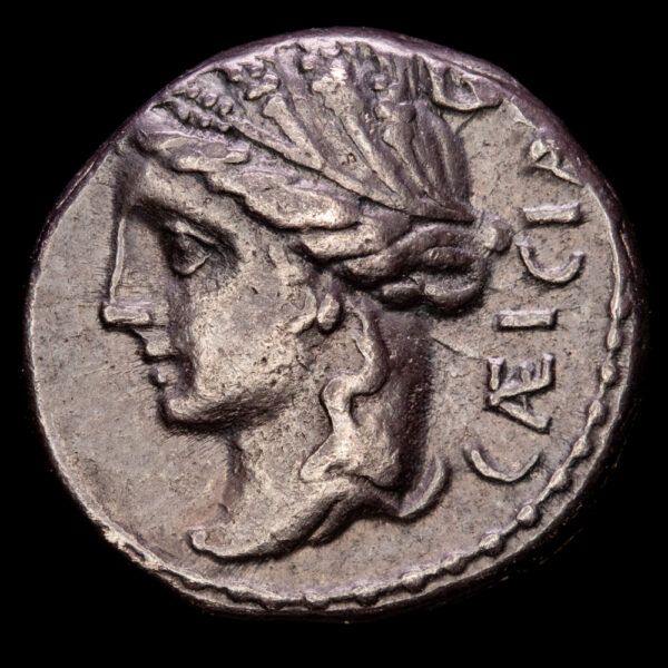 CASSIA. L. Cassius Caecianus. Denario (3,93 g.). Roma, 102 a.C. Anv.: Cabeza laureada de Ceres a izquierda, detrás (G). y leyenda: CAECIAN (AE y AN nexadas). Rev.: Dos bueyes a izquierda, arriba P. En exergo: L. CASSI. Cal-409; Craw-321/1 FFC-555; Se-4. MBC+.