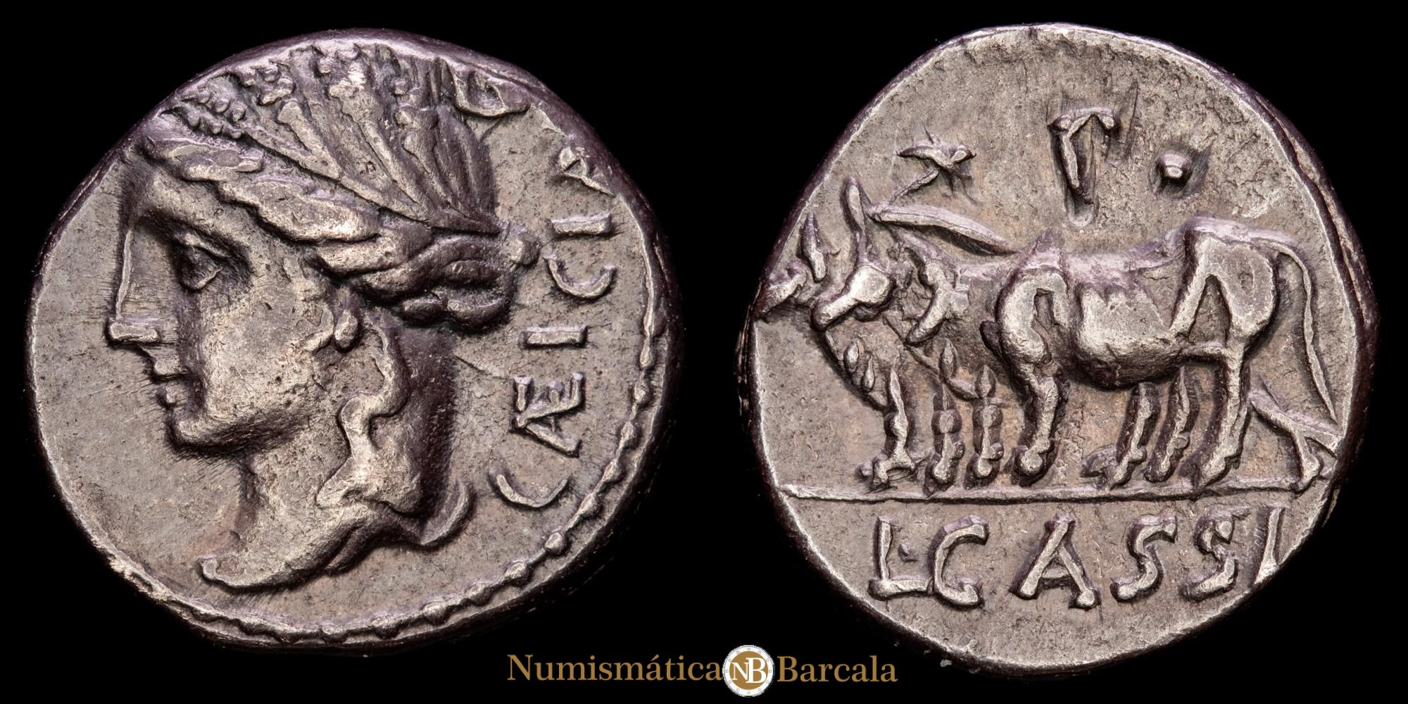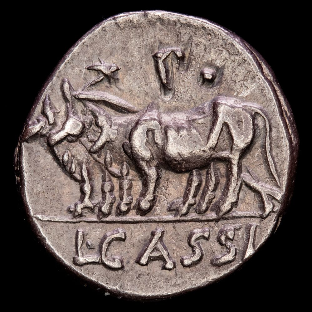 CASSIA. L. Cassius Caecianus. Denario (3,93 g.). Roma, 102 a.C. Anv.: Cabeza laureada de Ceres a izquierda, detrás (G). y leyenda: CAECIAN (AE y AN nexadas). Rev.: Dos bueyes a izquierda, arriba P. En exergo: L. CASSI. Cal-409; Craw-321/1 FFC-555; Se-4. MBC+.