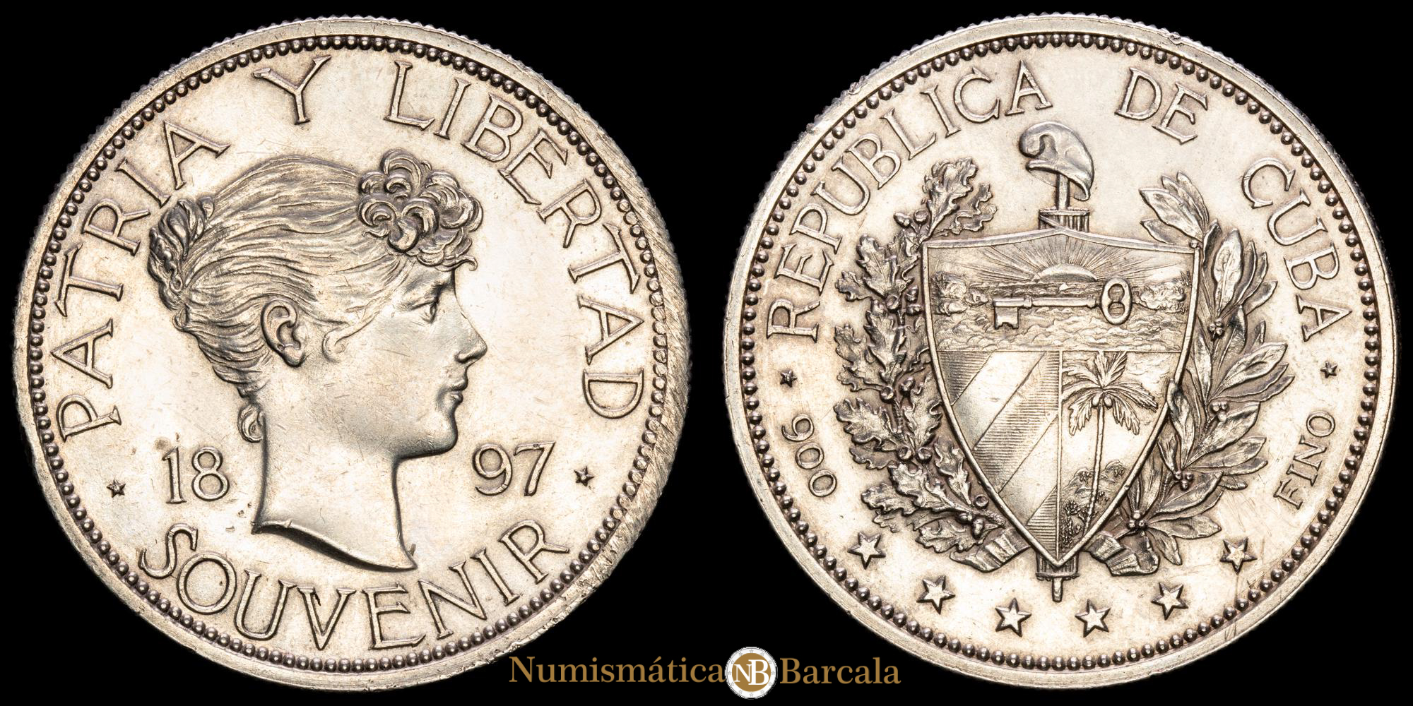 Numismática Barcala > Productos > Monedas Mundiales > America Sur > Cuba > Cuba – República. 1 Peso. (22,45g.). Cuba. 1897. KM-XM3. XF+. Variante de fecha junta.