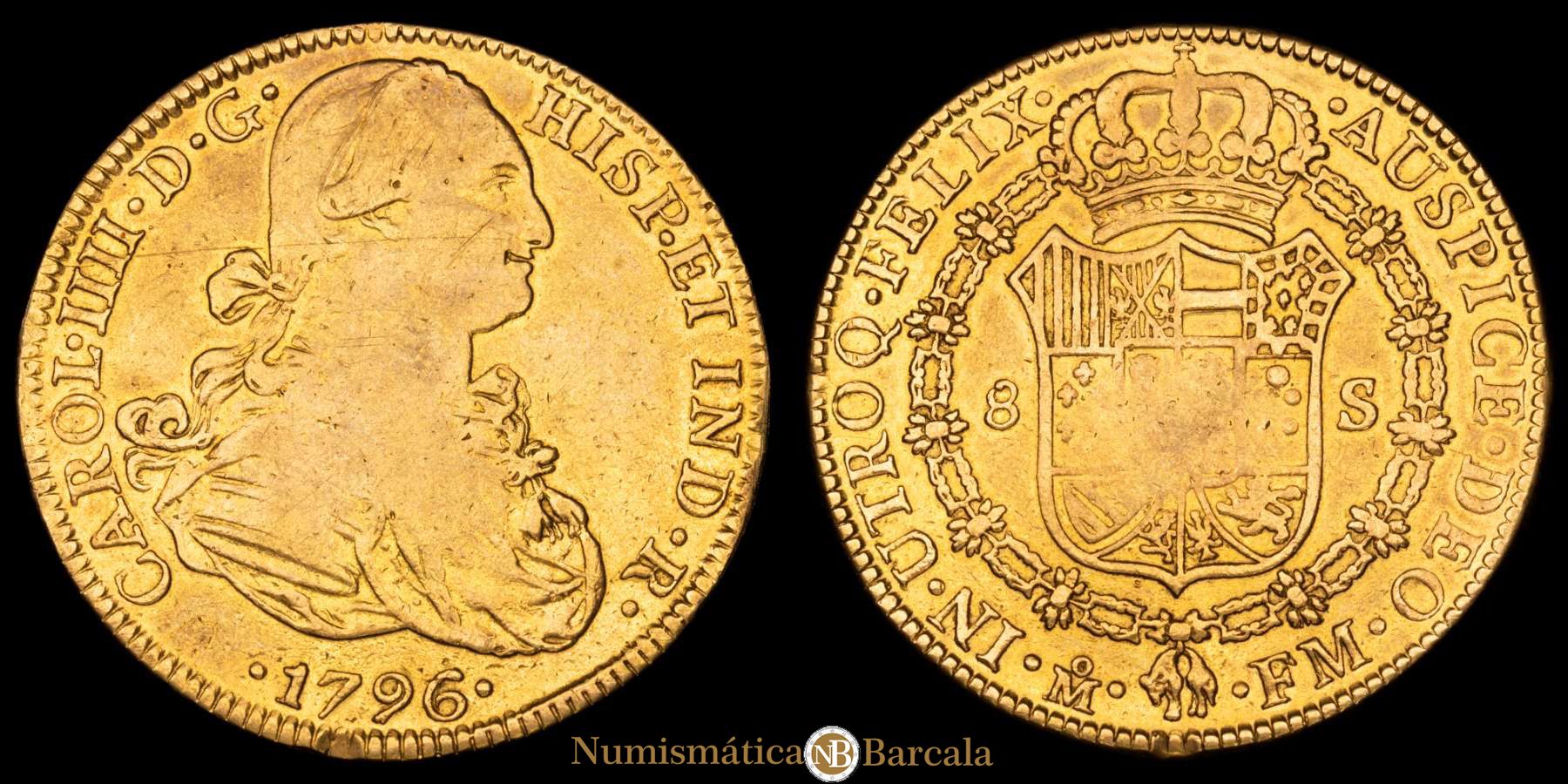 España – Carlos IV (1788- 1808) 8 escudos (26,90 g.). Ceca de Mexico, 1796. Ensayador FM. Cal-1636. MBC+.