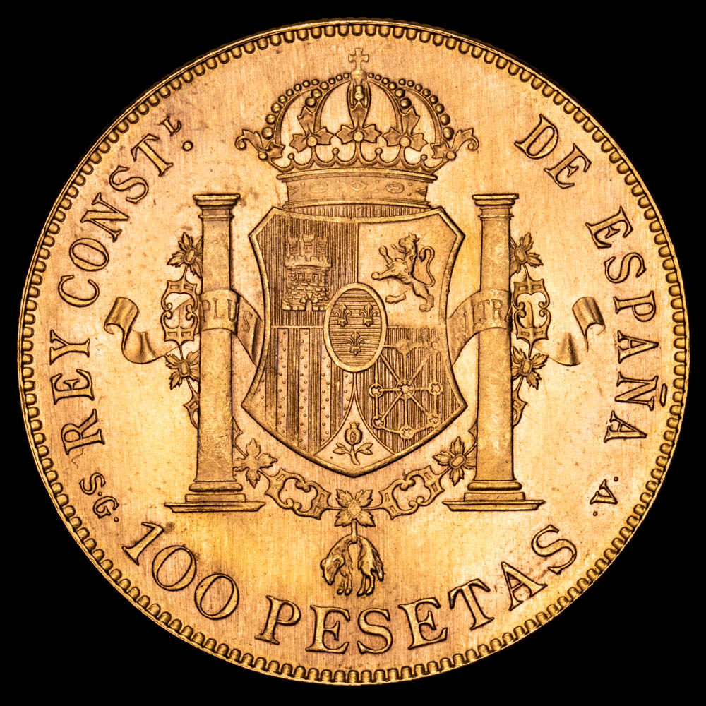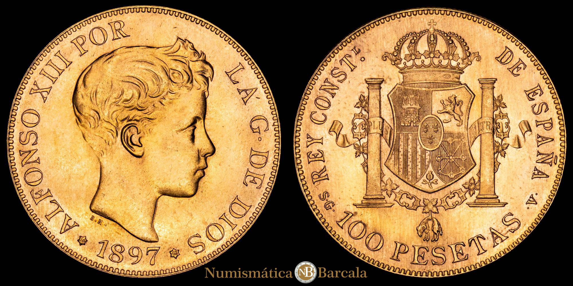 España – Estado Español. 100 Pesetas. (32,3 g.). Madrid. 1897 *19-62*. Ensayador SG·V. Aureo y Calicó 177. SC-. Reacuñación.