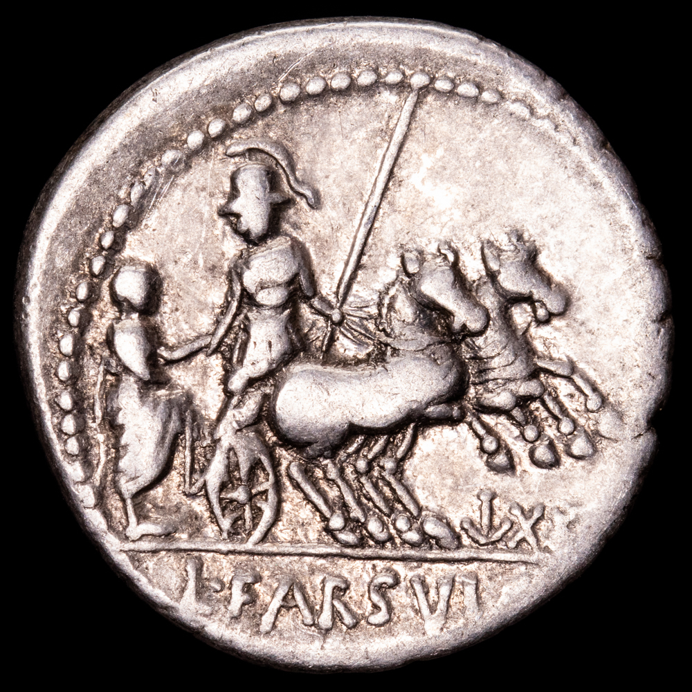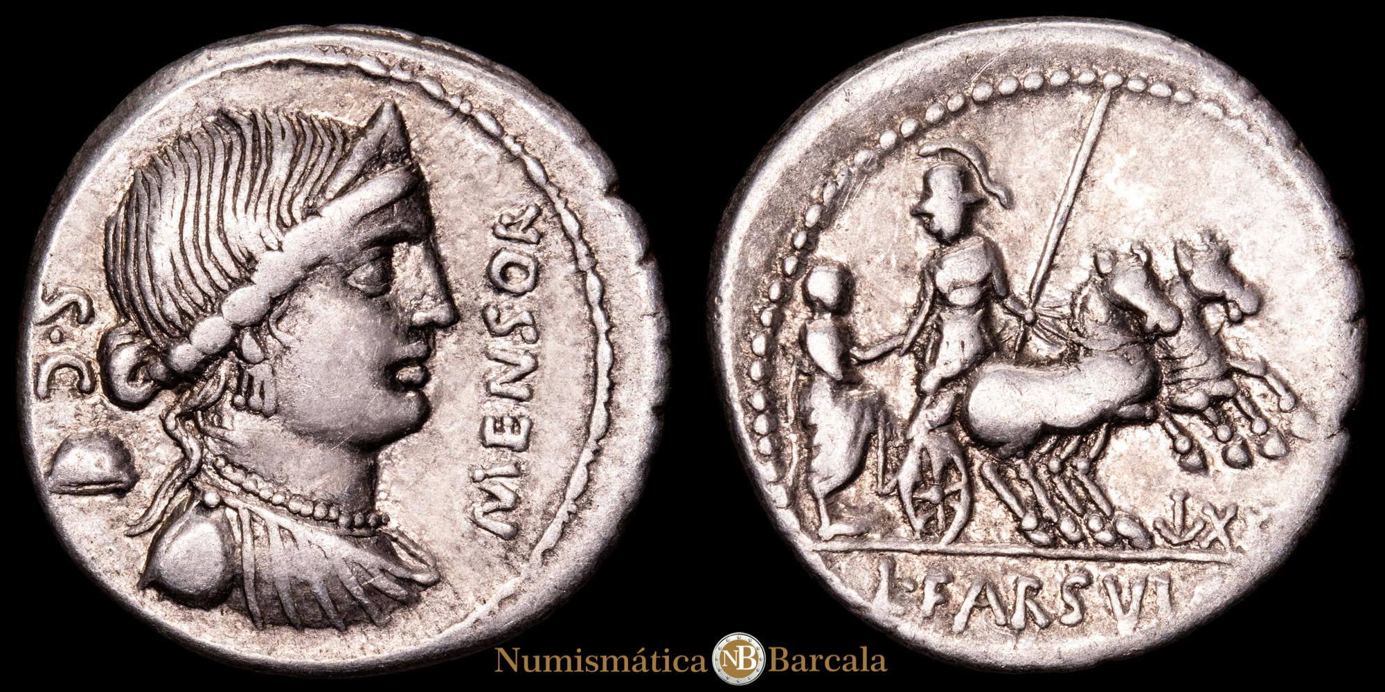 Numismática Barcala > Productos > Romanas > REPÚBLICA > Farsuleia. Denario. (3,93 g.). Roma. 75 a.C.. FFC-706. MBC+. R: L-FARSULE
