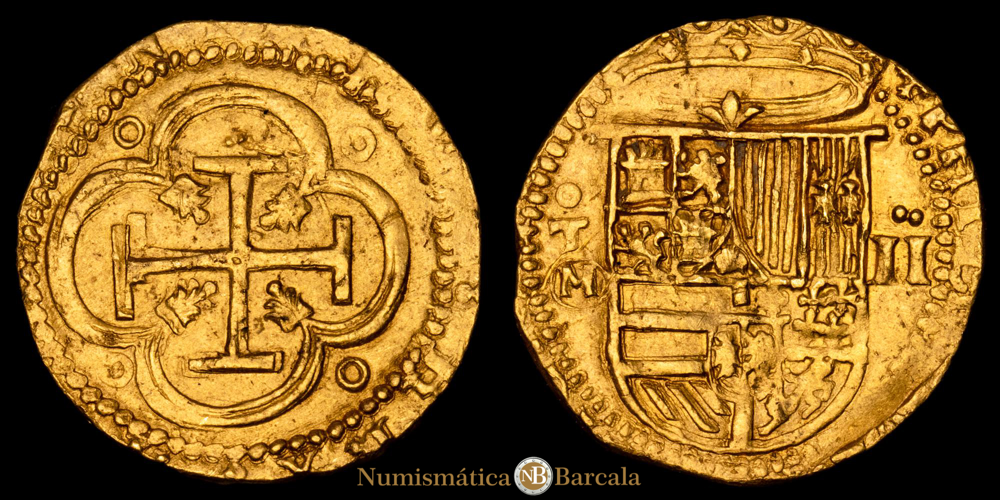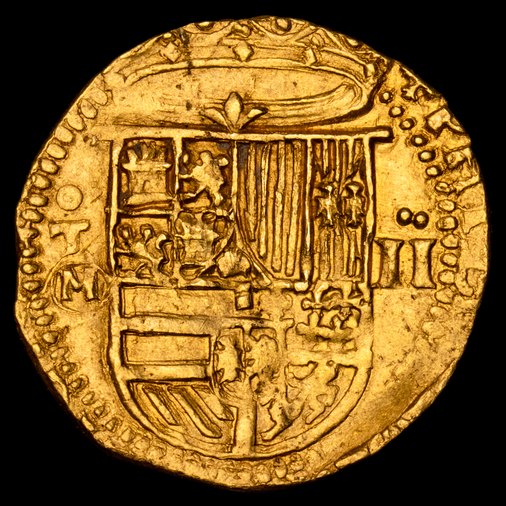 Numismática Barcala > Productos > Monarquia Española > Austrias > 1556-1598 Felipe II > Felipe II. 2 Escudos (6,75 g.) Toledo. (1556-1598). Ensayador M. Aureo y Calicó – 865. EBC-. Rara.
