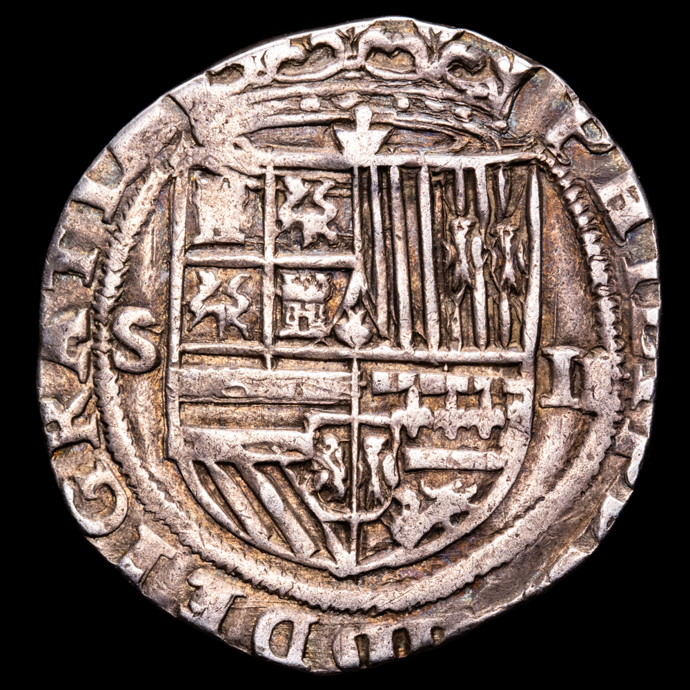 Felipe II. 2 Reales. (6,87 g.). Sevilla. Antes 1588. “Cuadrado”. AC-400. MBC+. Bella. Ensayador “D cuadrada” en reverso fuera del cuarto cuartel.