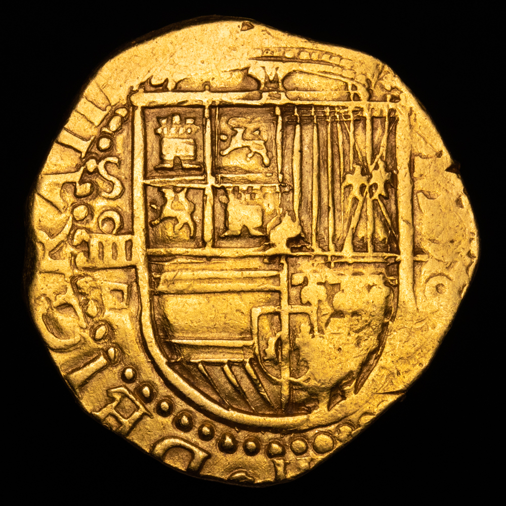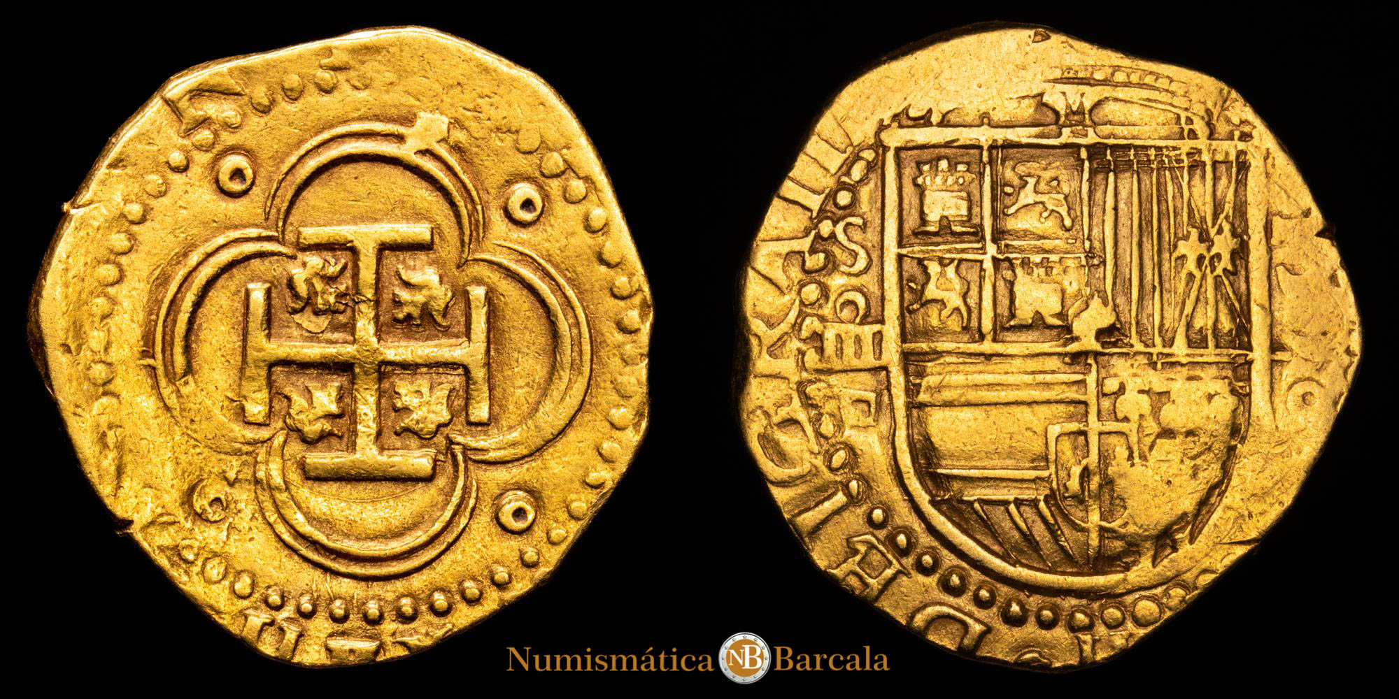 Numismática Barcala > Productos > Monarquia Española > Austrias > 1556-1598 Felipe II > Felipe II. 4 Escudos. (13,46 g.). Sevilla.1590. Ensayador “D cuadrada”. Aureo y Calico-893. MBC+. Rara.