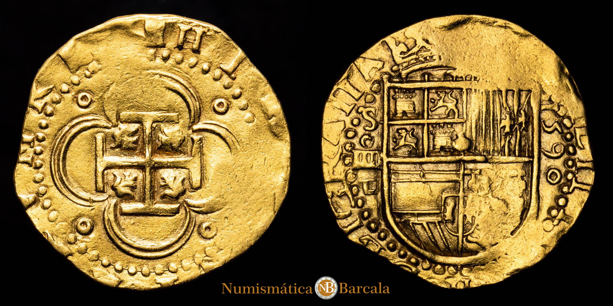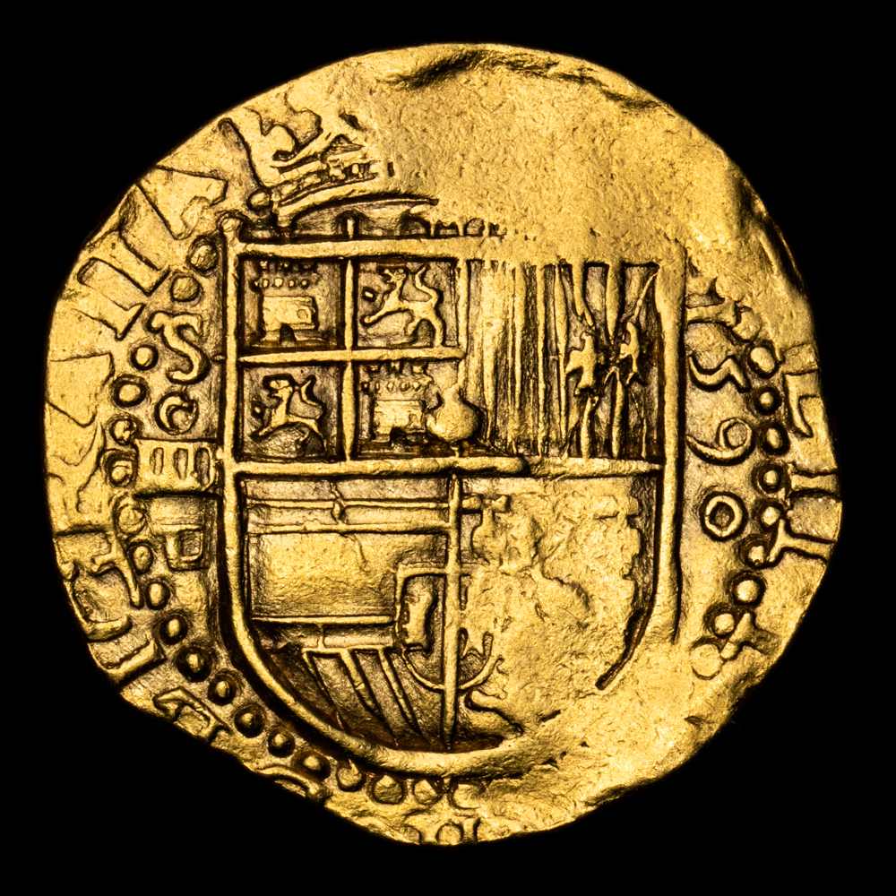 Felipe II. 4 Escudos. (13,47 g.). Acuñados en Sevilla. 1590. Ensayador “D cuadrada”. Aureo y Calicó – 893. MBC+. Muy rara.