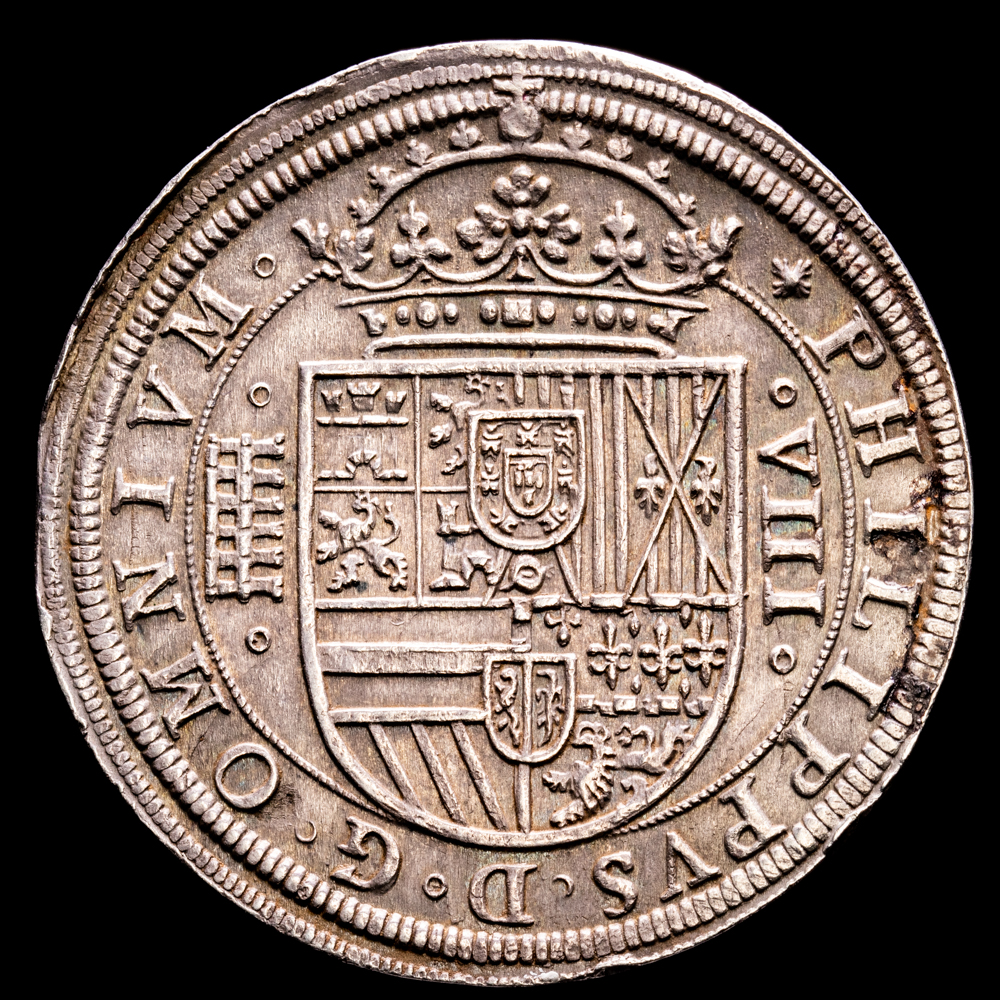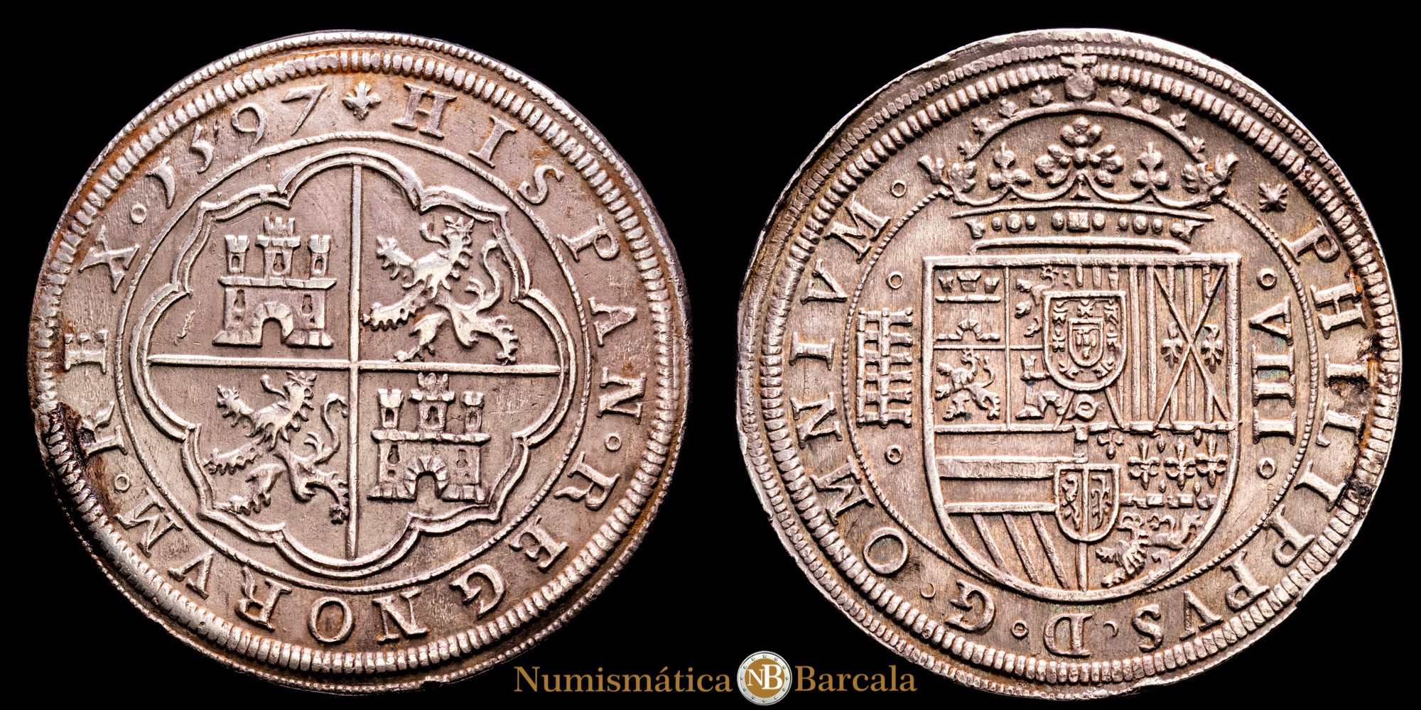 Numismática Barcala > Productos > Monarquia Española > Austrias > 1556-1598 Felipe II > Felipe II. 8 Reales (27,19 g.). 1597. Segovia. Aureo y Calicó -718. Cal-232. Rara . EBC+/EBC-