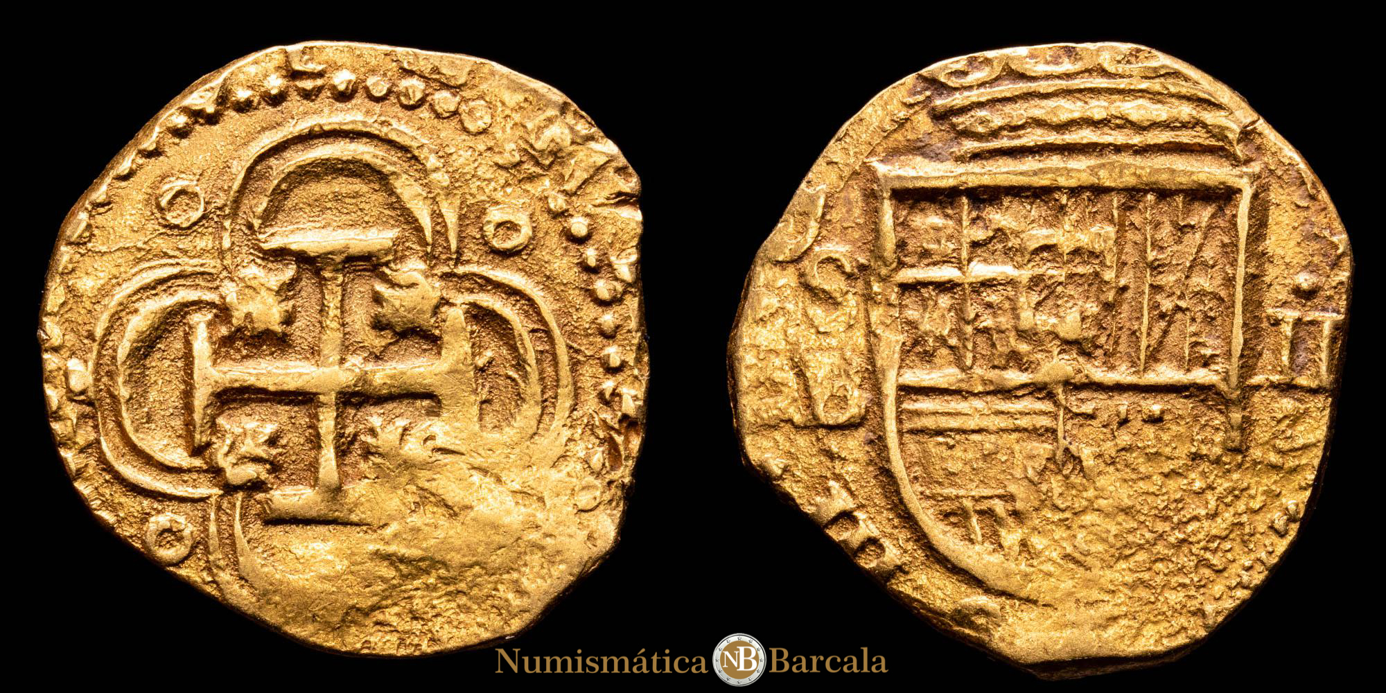 Numismática Barcala > Productos > Monarquia Española > Austrias > 1598-1621 Felipe III > Felipe III. 2 Escudos. (6,82 g.). Sevilla. S/F. Ensayador B. Aureo y Calicó – tipo – 195. MBC+. Cuño oxidado